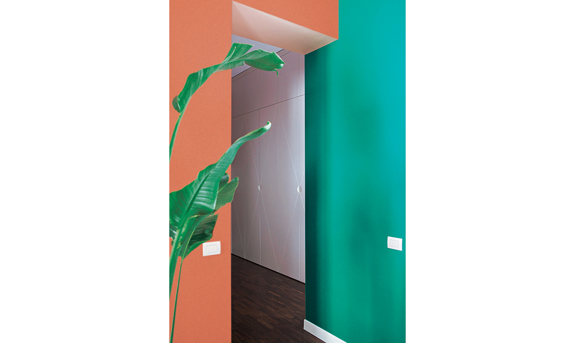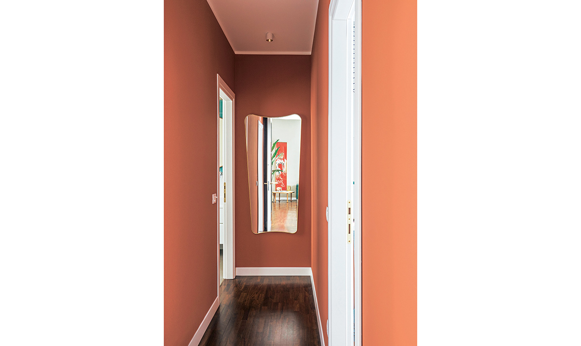Il color ruggine già presente nel living esprime il suo legame caratterizzante con le geometrie anche nel disimpegno: è perfetto con il parquet.