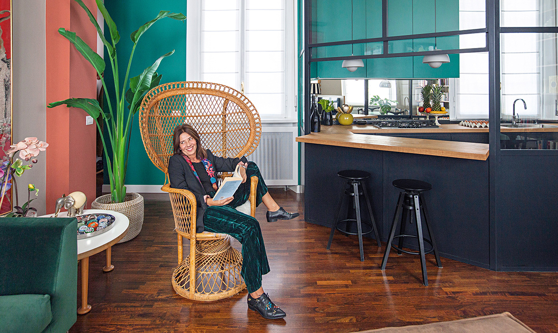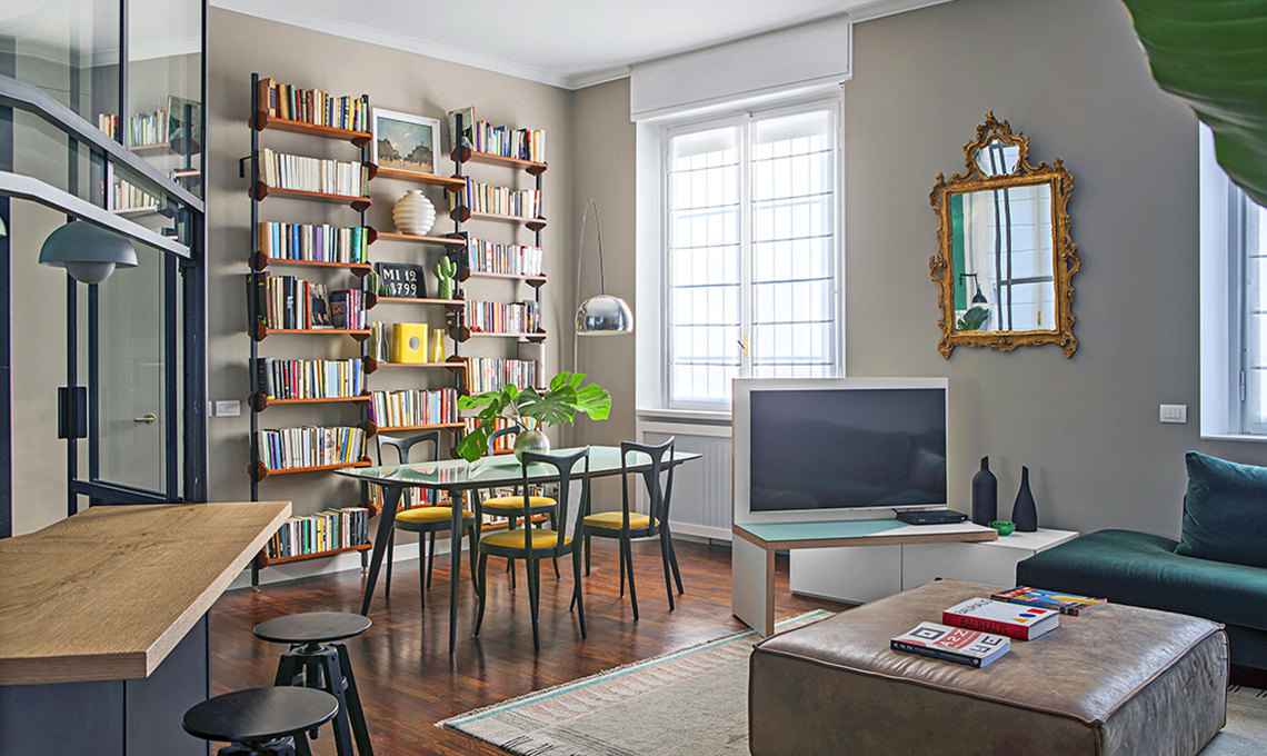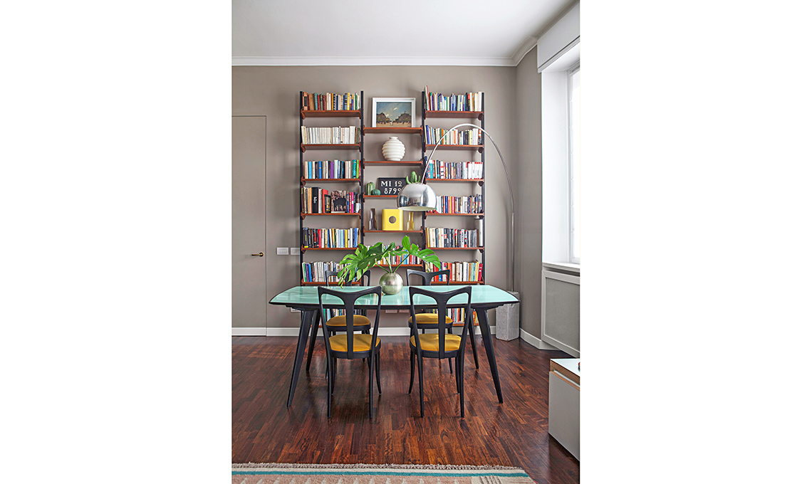 Luce Arco [Flos € 1.970]. La libreria Anni ’60 era dei suoceri: se ne possono trovare di simili su subito.it. Il tavolo, acquistato a un mercatino dell‘antiquariato, è stato modificato dall‘architetto che ne ha ridisegnato il piano in vetro colorato. Le sedie sono rinate con un fai-da-te:s ono state ridipinte di nero e rivestite con un tessuto in cotone color zafferano.