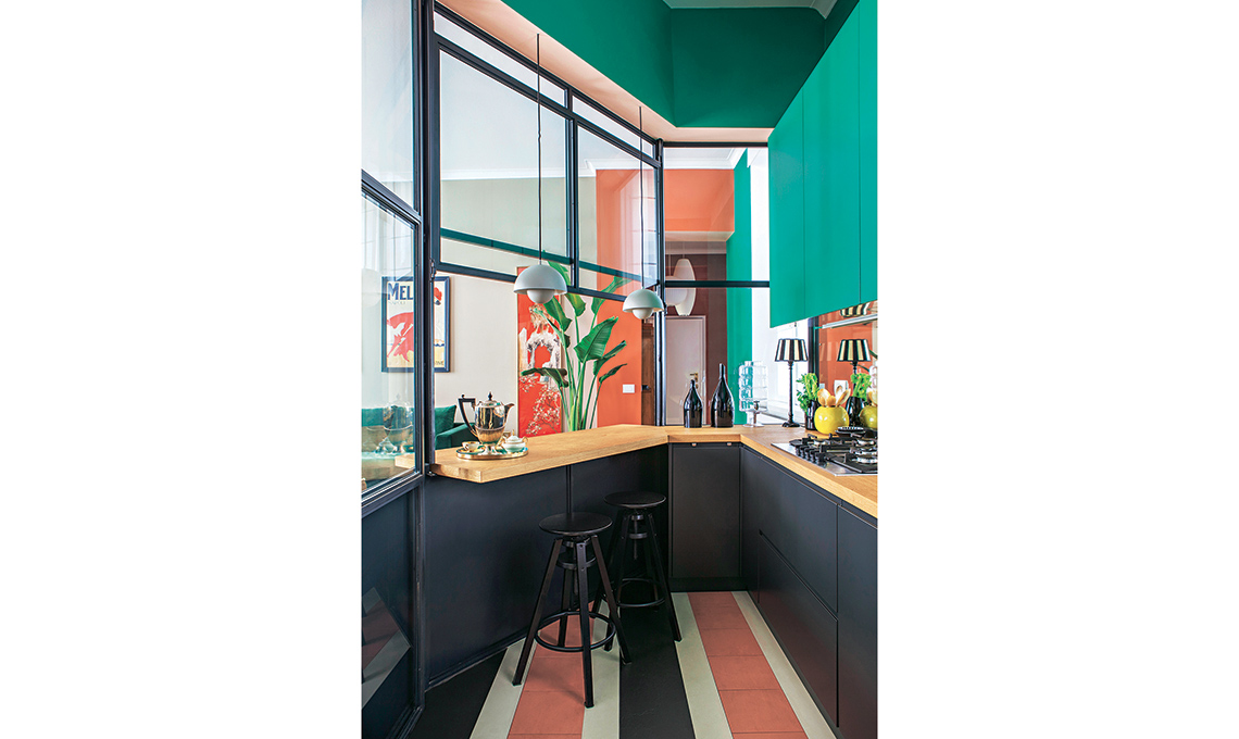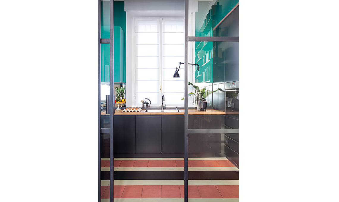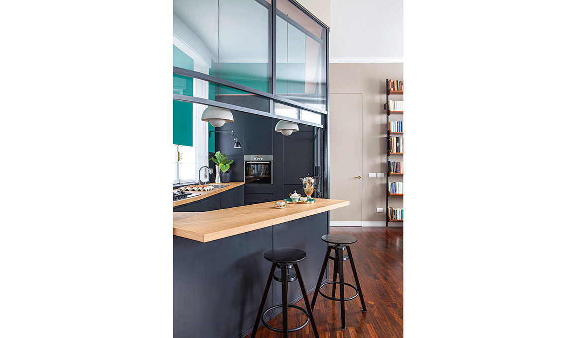 l'idea da copiare? La porzione di vetrata sopra il banco che si apre e si chiude grazie a una motorizzazione elettrica: quando si cucina, si tira giù per non far passare gli odori.