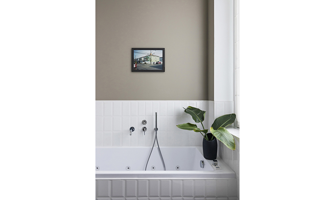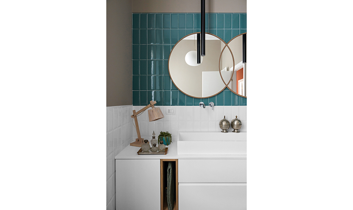 Nel bagno, rivestimenti [Ceramica Vogue], lavabo [Antonio Lupi], lampada da tavolo Wood Lamp di Taf Studio per [Muuto€149], luci a sospensione [Boffi].