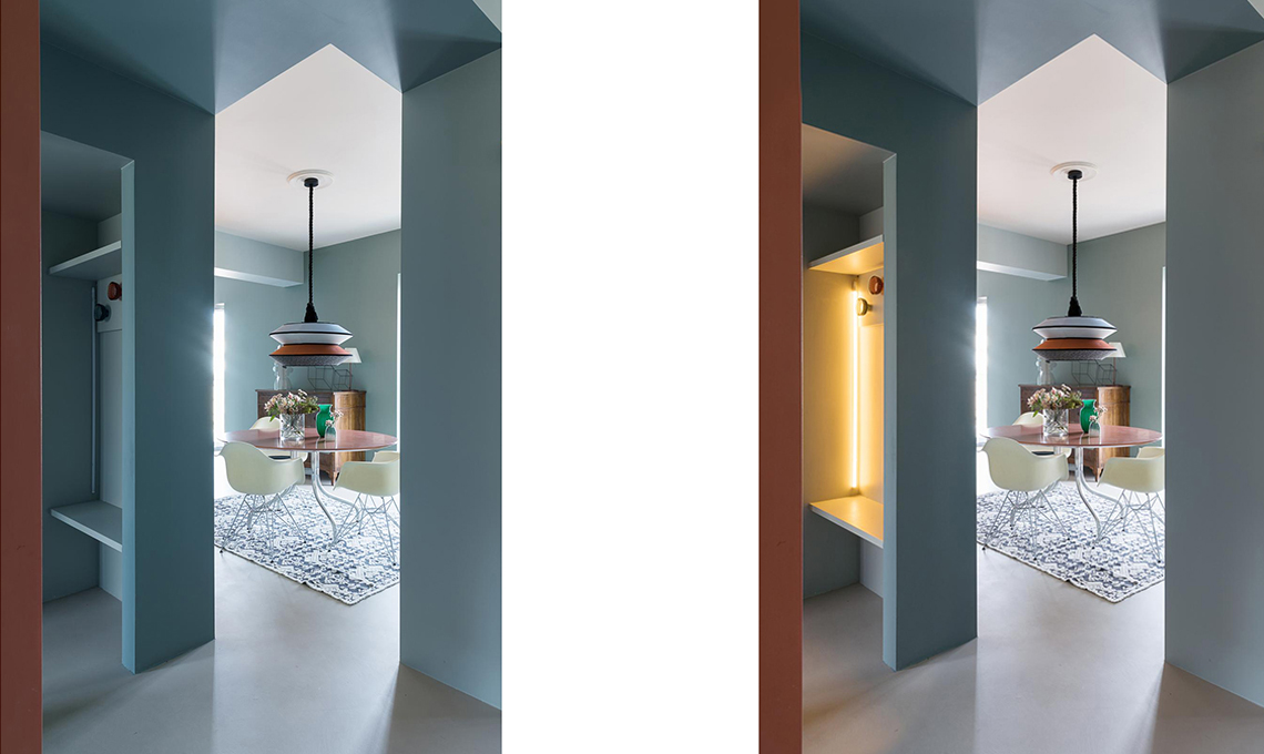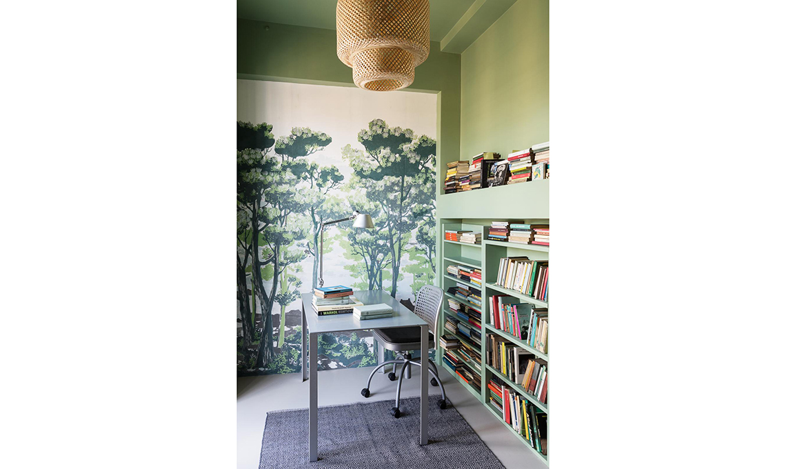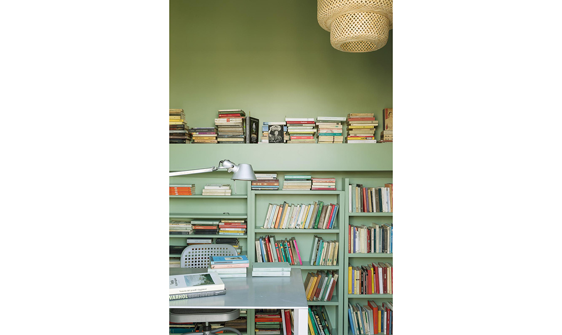 Nello studio di Lia, cos come un po’ ovunque, nicchie, piccoli arredi e librerie sono stati dipinti dello stesso colore delle pareti degli ambienti che li ospitano, per rafforzare la sensazione di pulizia ricercata dai proprietari. «Con questo escamotage, gli elementi diventano quasi ‘strutturali’ e diminuiscono il ‘rumore visivo’ dei tanti libri accatastati