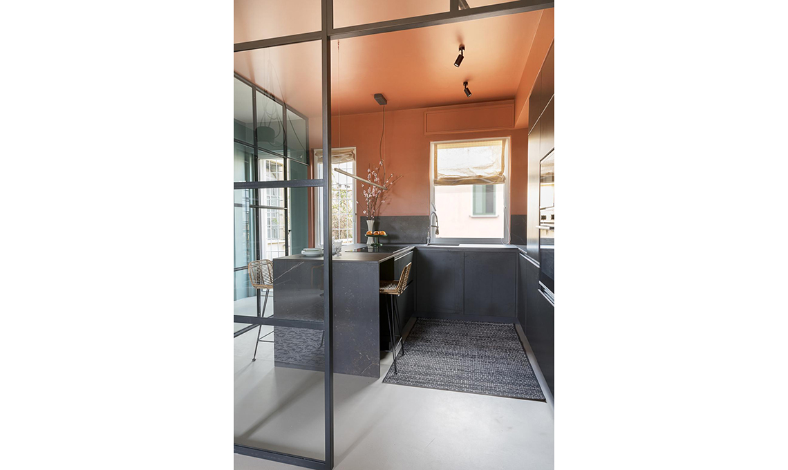 Cucina con top in Dekton [Valdesign da Frisetti Arredamenti], sgabelli Rattan bar stool [HKliving], tappeto [La Redoute], lampada tubolare a Led [Renzo Serafini], alzatina High Tray Edera [Vitra]. Vetrata con top realizzata con sistemi [Ottostumm Mogs]. Il colore a parete e sul soffitto è Book Room Red [Farrow&Ball].