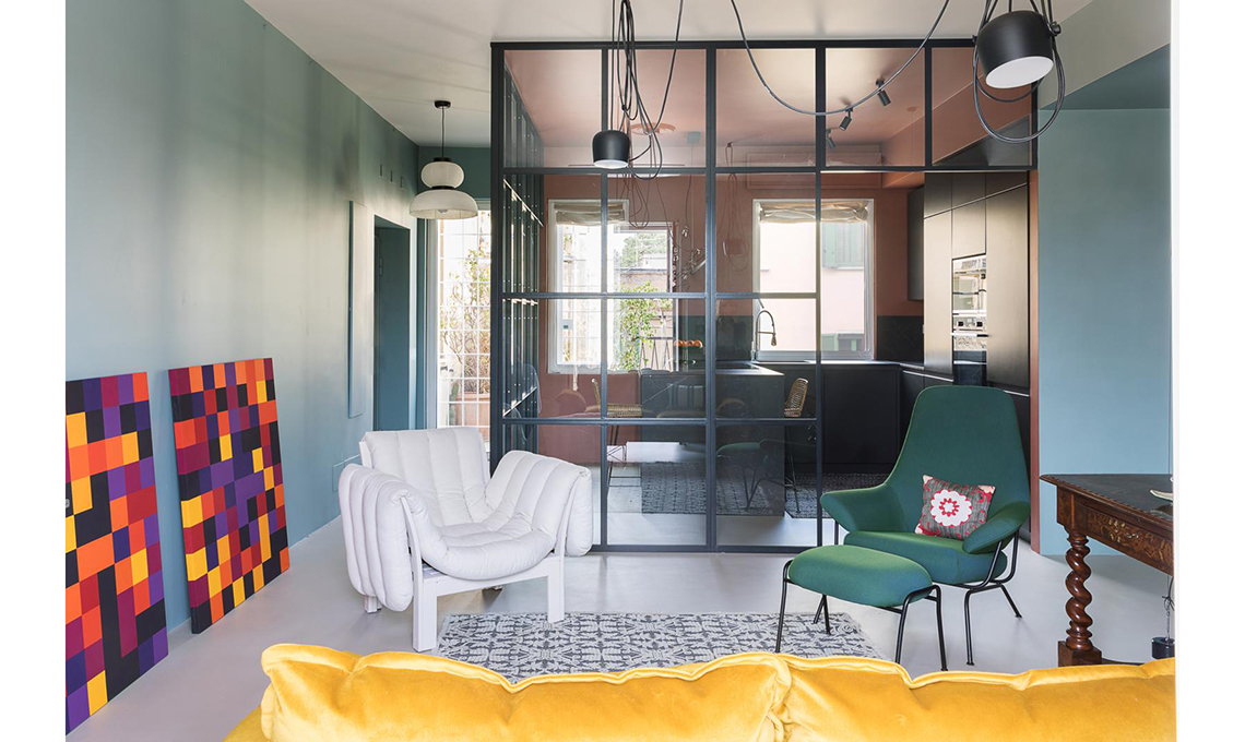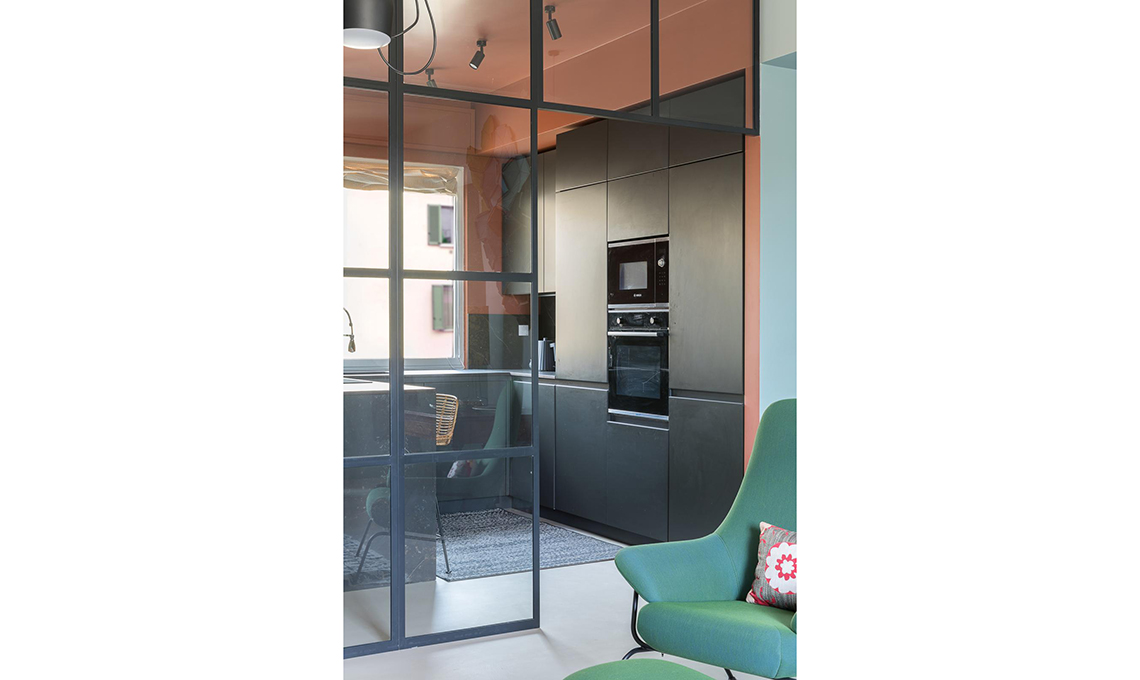 L’idea iniziale di Lia e del marito Stefano era di garantire il massimo della fluidità, con passaggi senza ostacoli di luce e aria; obiettivo raggiunto dall’architetto Paola Del Fabro con l’apertura della pianta senza interruzioni, a eccezione della camera padronale e dei servizi. La cucina, posizionata proprio davanti all’entrata, è stata inglobata all’interno di una vetrata angolare che la contiene, mentre con altre pareti di ferro e vetro sono schermate le due piccole stanze che si trovano all’estremità dell’appartamento, studio e camera ospiti.