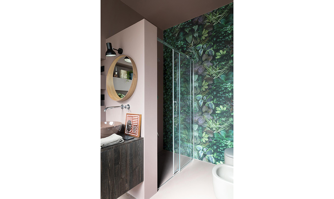 Anche i bagni sono in resina, uno azzurro intenso e il secondo color melanzana che si abbina a una quinta di grès effetto vegetale che ricorda i giardini verticali di Patrick Blanc.