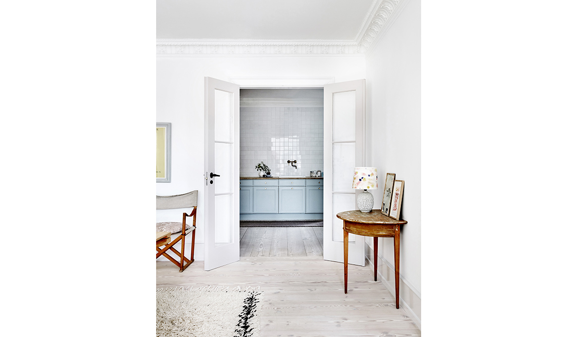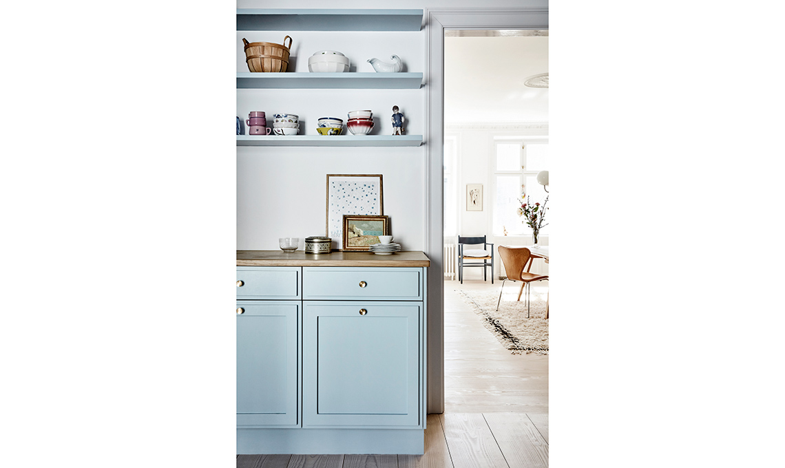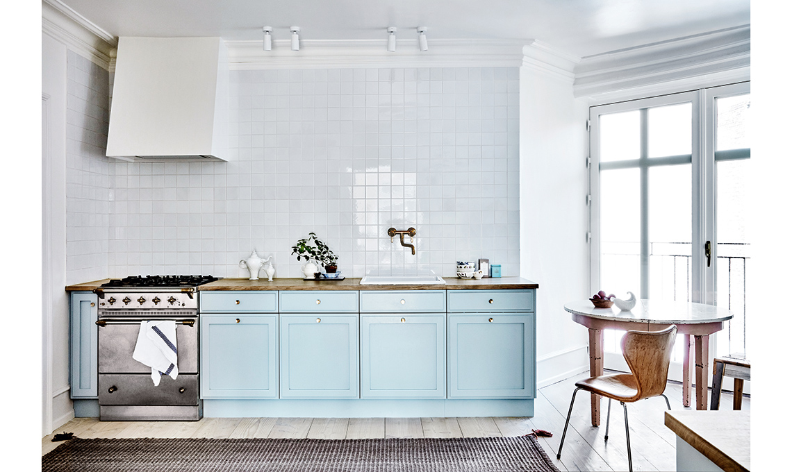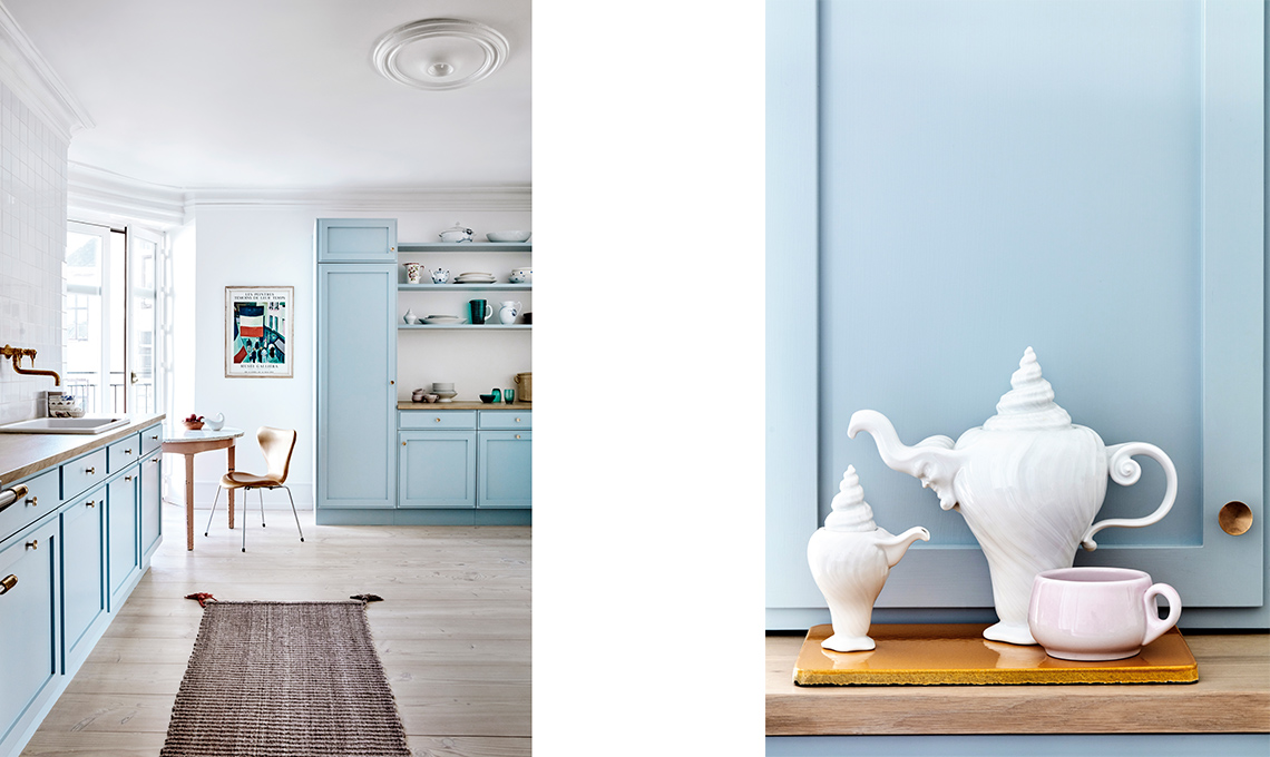L'azzurro è leggero e polveroso quanto basta: è ’Parma Grey’ [Farrow&Ball]. La cucina ha una chiara impronta classica ma sposa un’essenzialità tutta nordica.