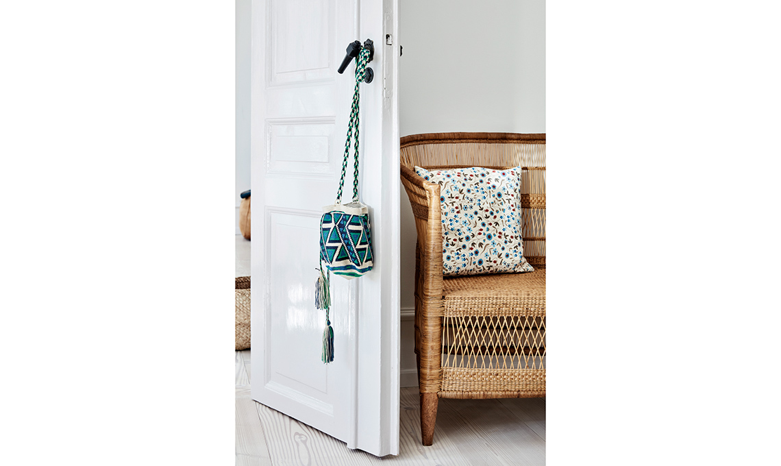 La visuale si apre con un mix di materiali naturali, quello del tappeto e il rattan della panchetta. La sovrapposizione crea un effetto a ’strati’ che ha più impatto. Prova anche con la paglia di Vienna!