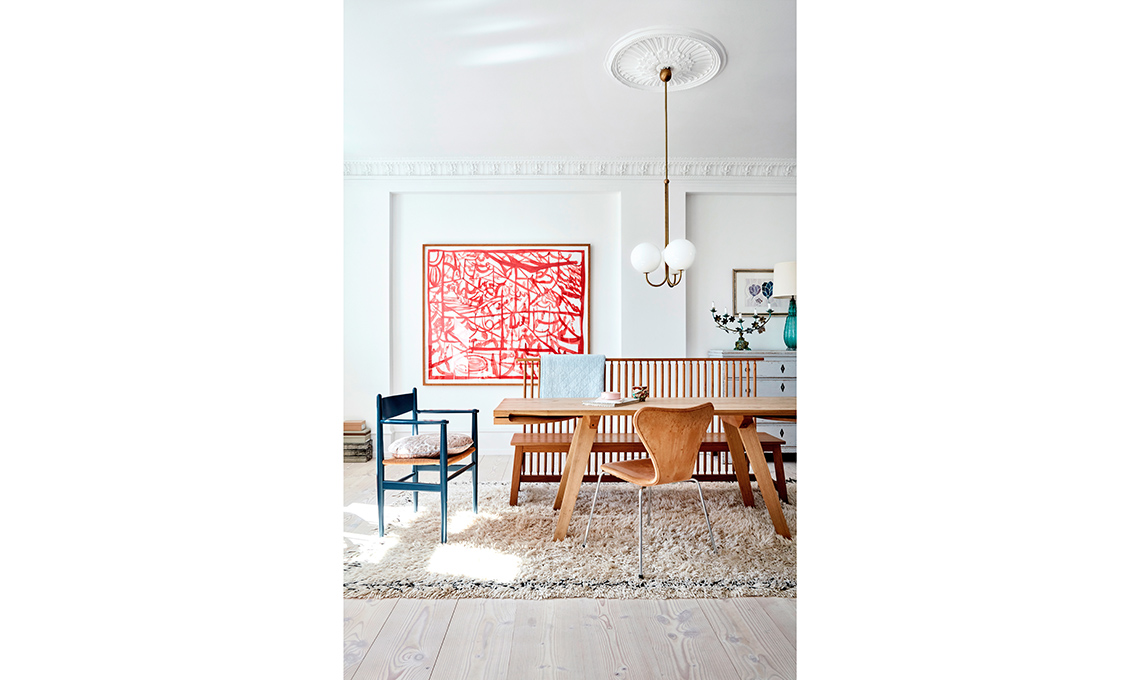 Tavolo e panca progettati dalla designer Ilse Crawford, sedia blu CH36, icona del design nordico firmata Hans J. Wegner [Carl Hansen & Son], cuscino [Tapet Cafe]. Celebre anche la seduta Serie 7 di Arne Jacobsen, qui in cuoio cognac [Fritz Hansen da €397]. L’opera rossa
