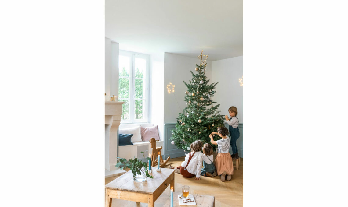 Durante i giorni di attesa del Natale, accanto al camino di marmo rosa, viene allestitala ‘stanza della musica’, come ama definirla Hélène. È qui che la piccola Hermïone si esercita intonando con l’arpa i tradizionali canti natalizi per la vigilia. Applique a braccio Swing in ottone lucido [House Doctor, com 70 € 215].
