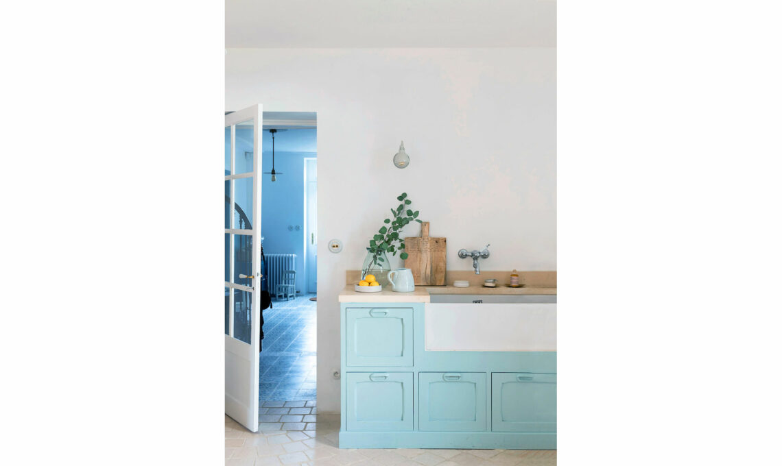Gli stucchi e le piastrelle decorate in blu sembrano tessere un tappeto all'ingresso. Sono un omaggio alle case francesi del XIX secolo. In blu scuro le porte e la boiserie.