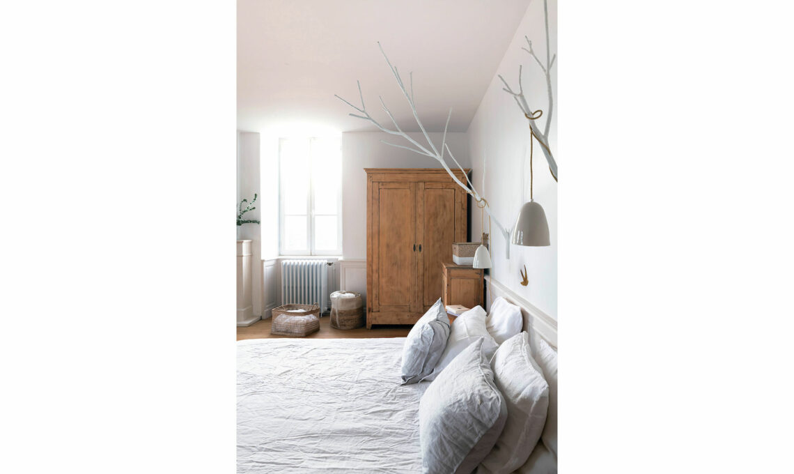 Il letto appoggiato sulla pedana sfrutta la boiserie grigio perla come testata, a cui si aggiungono due rami sbiancati che reggono lampade in ceramica. Come comodini, perfetti due tronchi di legno. Sospensione Mila, con telaio curvato in rattan e rete intrecciata a mano. Ogni lampada è un pezzo unico [Lovmint, ø cm 80 €139].