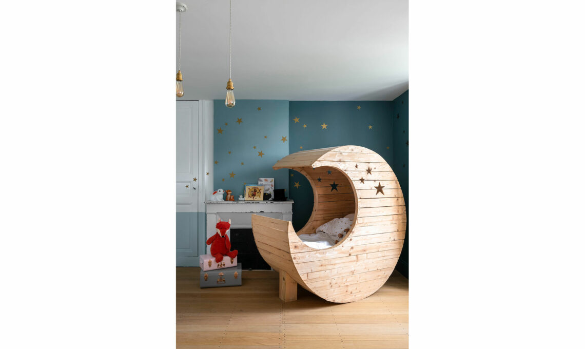 Il baldacchino da 'mille e una notte' è fissato con i tiranti. L'altalena in camera è il regalo di papà Antoine per i piccoli di casa.