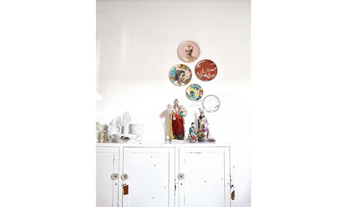 Le ceramiche sono una passione e si trovano un po' ovunque in casa. Forme e colori, ispirazioni e provenienze diverse. L’insieme risulta armonico grazie a tre ‘storie’ che comunicano tra loro ma hanno anche vita propria. La serie in bianco quasi-classico; i piatti che formano macchie di colore rotonde; le statuette diverse ma tutte di ispirazione etnica e sacra.