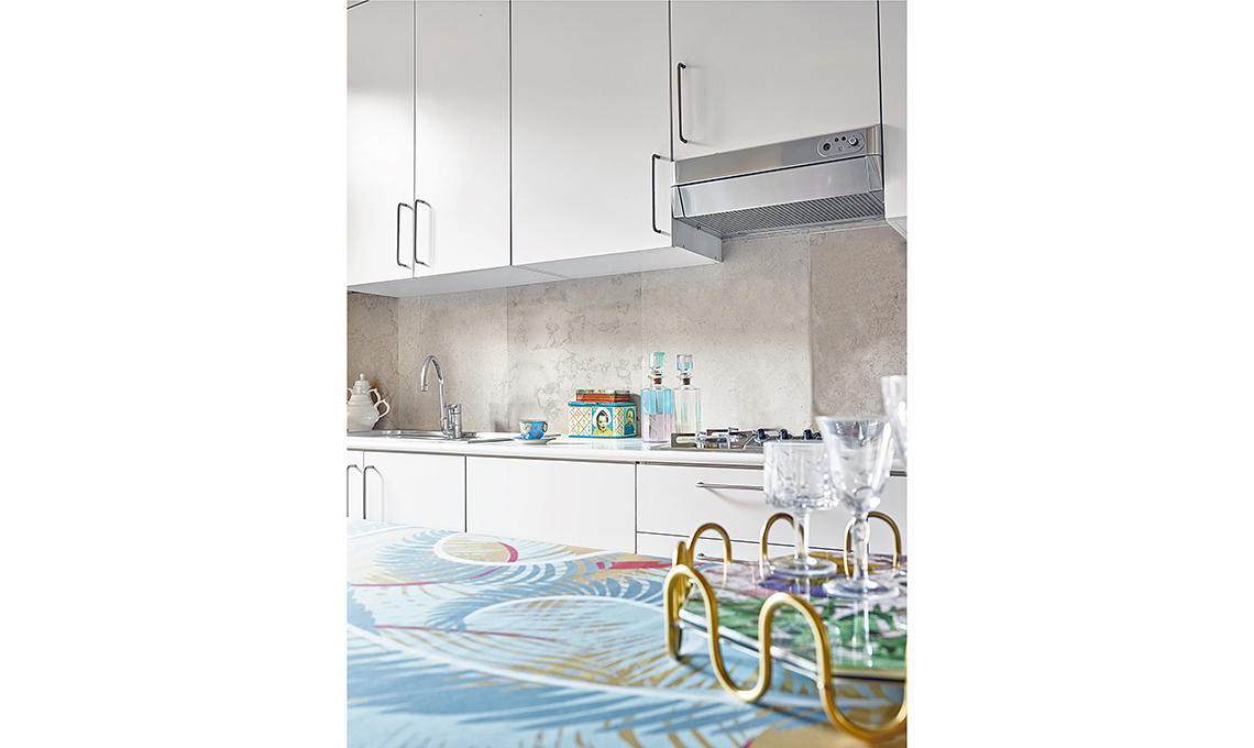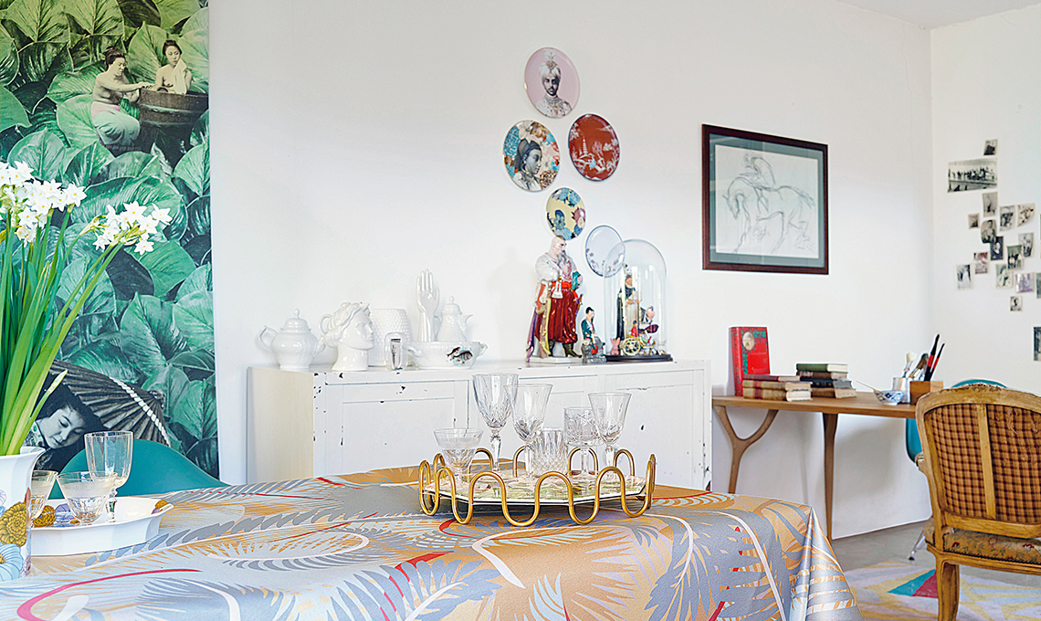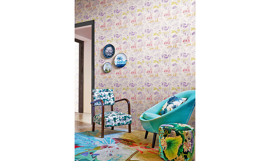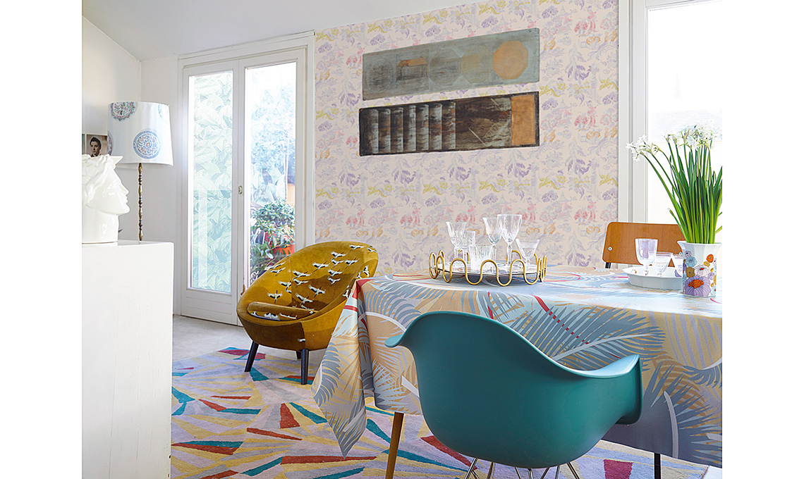Carta da parati Masami [Texturae] e, sul tavolo, tessuto Las Palmas Sunrise [Vito Nesta Grand Tour], entrambi design di Vito. vassoio Kyma, di Serena Confalonieri per [Sambonet] con lastra decorativa in porcellana Florilegium, di Vito per [Rosenthal].