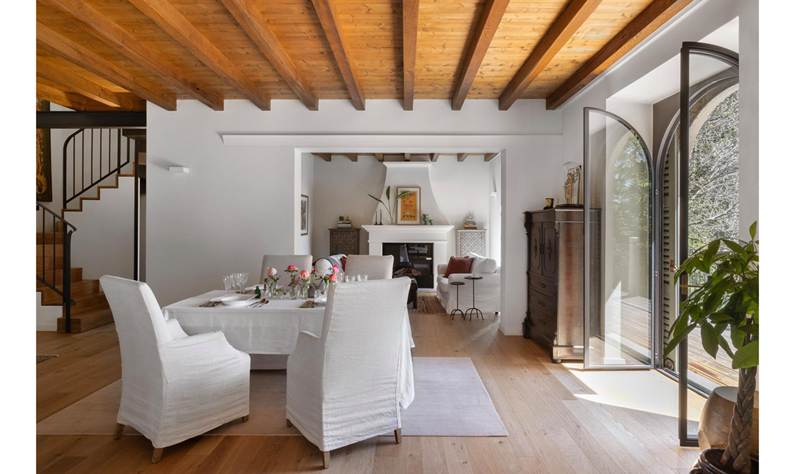 Gli ambienti comuni sono pensati come un’infilata che dalla cucina-living porta al salotto con camino passando dalla sala da pranzo. Ogni zona vive ‘guardando’ il terrazzo.