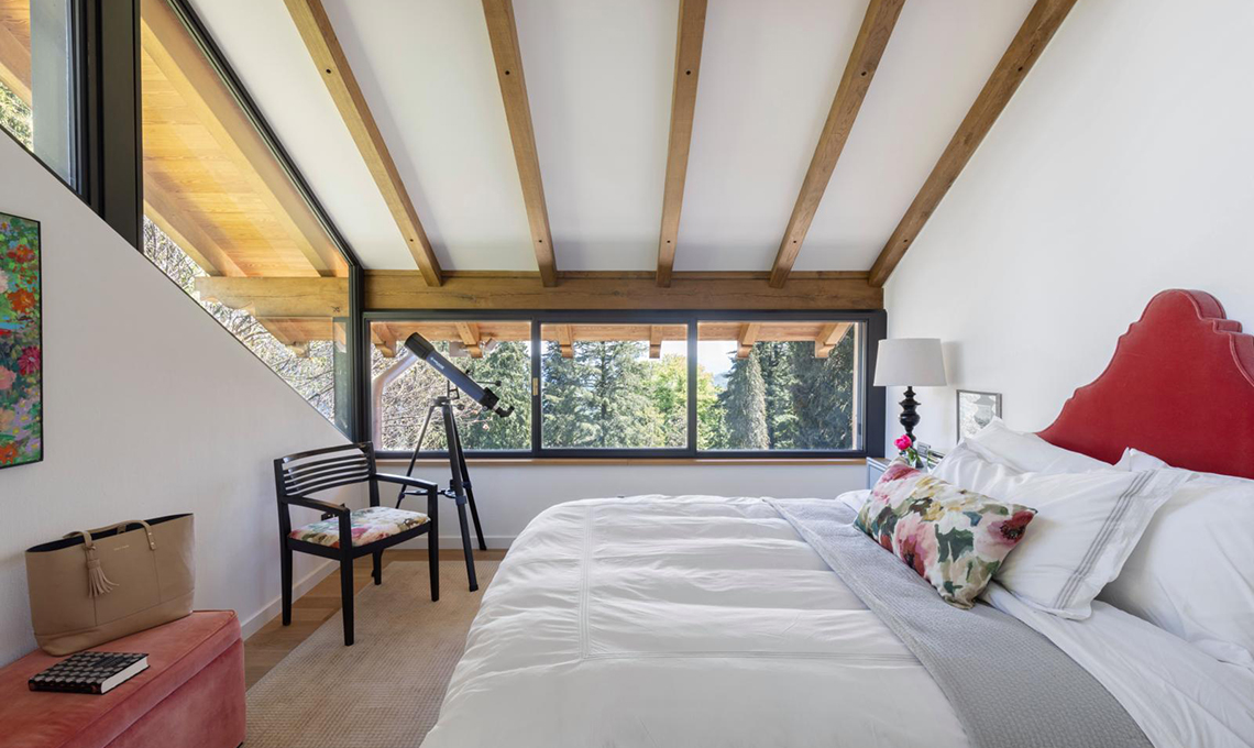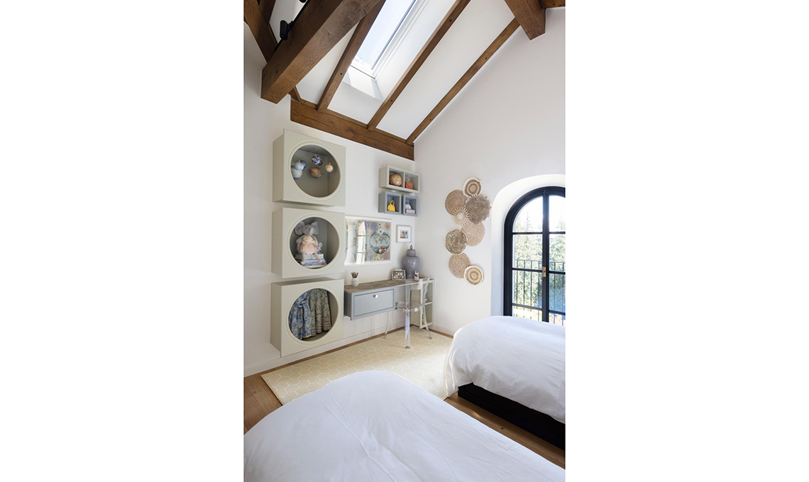 Grazie all’inserto in vetro, la camera di Meghan si è trasformata in un osservatorio aperto sulla natura. «Ogni mattina ci svegliamo con una tavolozza di colori diversa. Quando nevica i fiocchi volteggiano come in una boule de neige!» esclama.