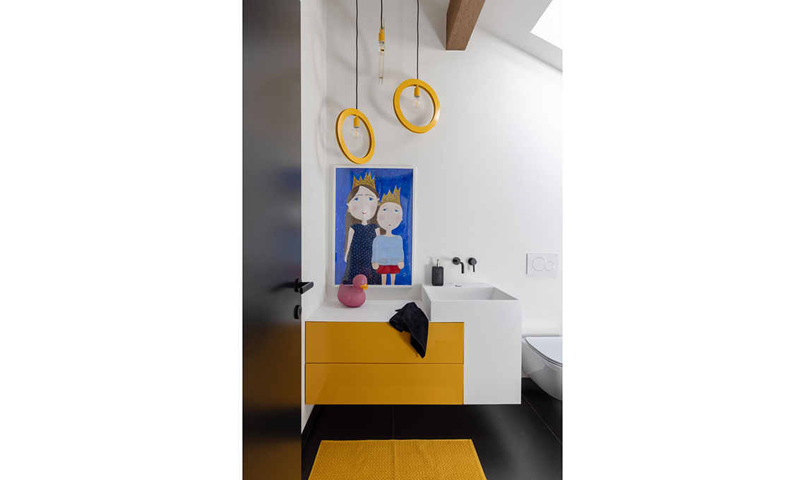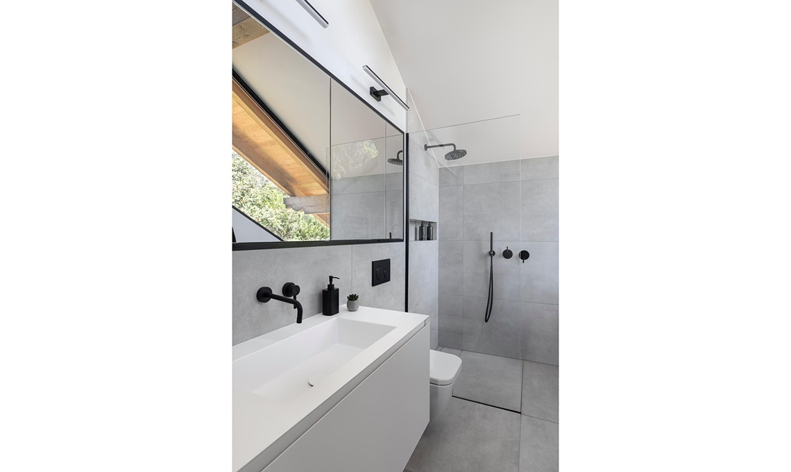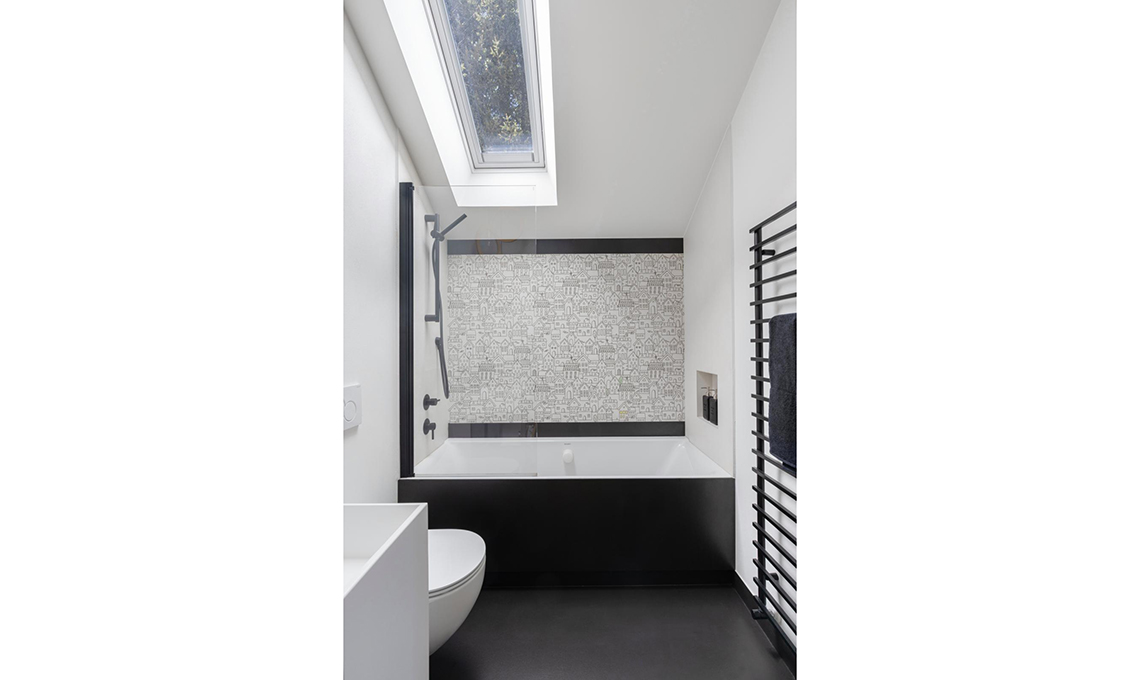 Il bagno è minimal e chic: rivestito quasi a tutta altezza, ha sanitari e lavabo bianchi; rubinetteria e specchio invece sono neri, come segni grafici che spiccano sulle pareti.