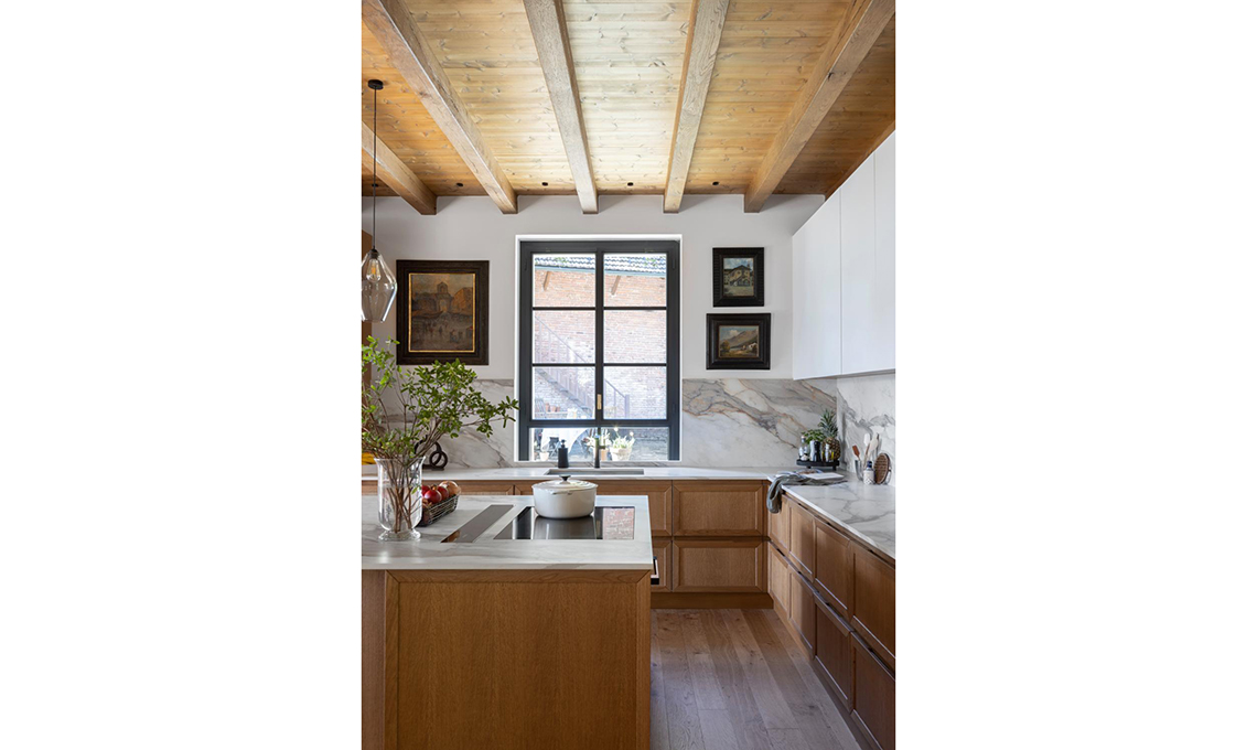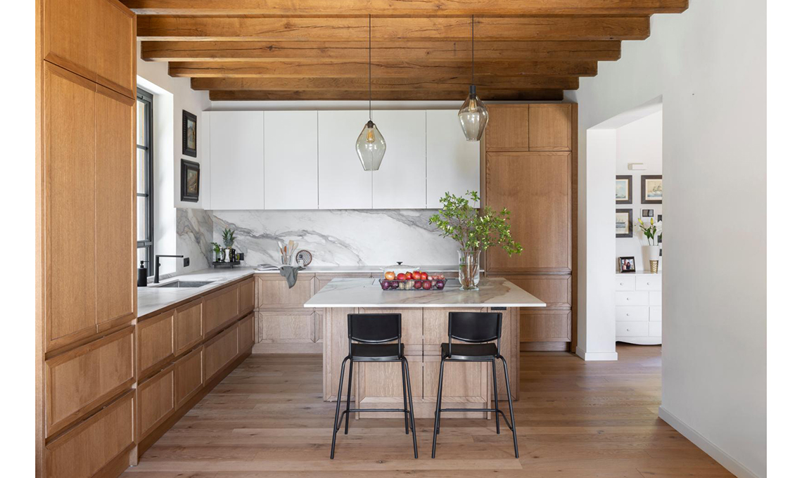 II rovere dal colore dorato scelto per i mobili della cucina, abbinato alle travi e