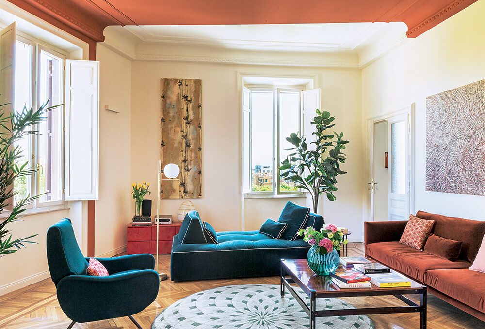 Sedie e poltroncine Gemma e Jim, recuperate e ritappezzate da [Blanco Tappezzeria da € 1.300], sospensioni Beat [Tom Dixon da € 460], applique e piantana Mite [Foscarini da € 1.011,38]. A destra, piante [Ikebana].