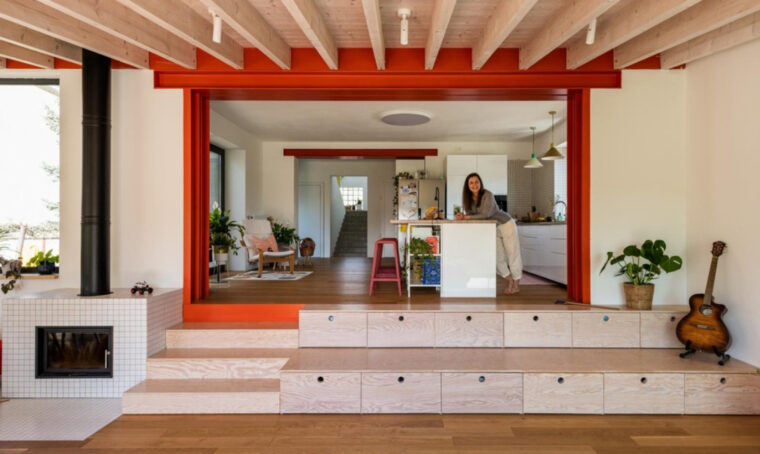La zona pranzo è un tutt’uno con la cucina, separata solo all’occorrenza da una grande porta in vetro e legno.