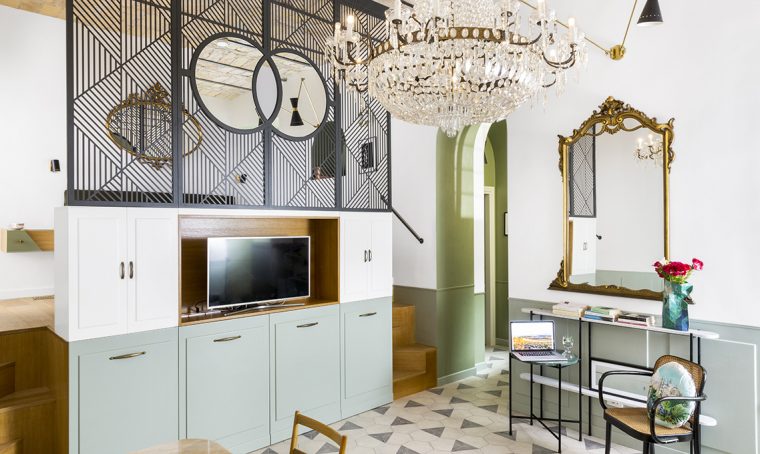 Carlotta ha tagliato la parete divisoria creando un’apertura che incornicia lo studio e il living. Una ‘finestra’ che crea continuità visiva. Un esercizio di stile, in un gioco estetico di volumi e prospettive.
