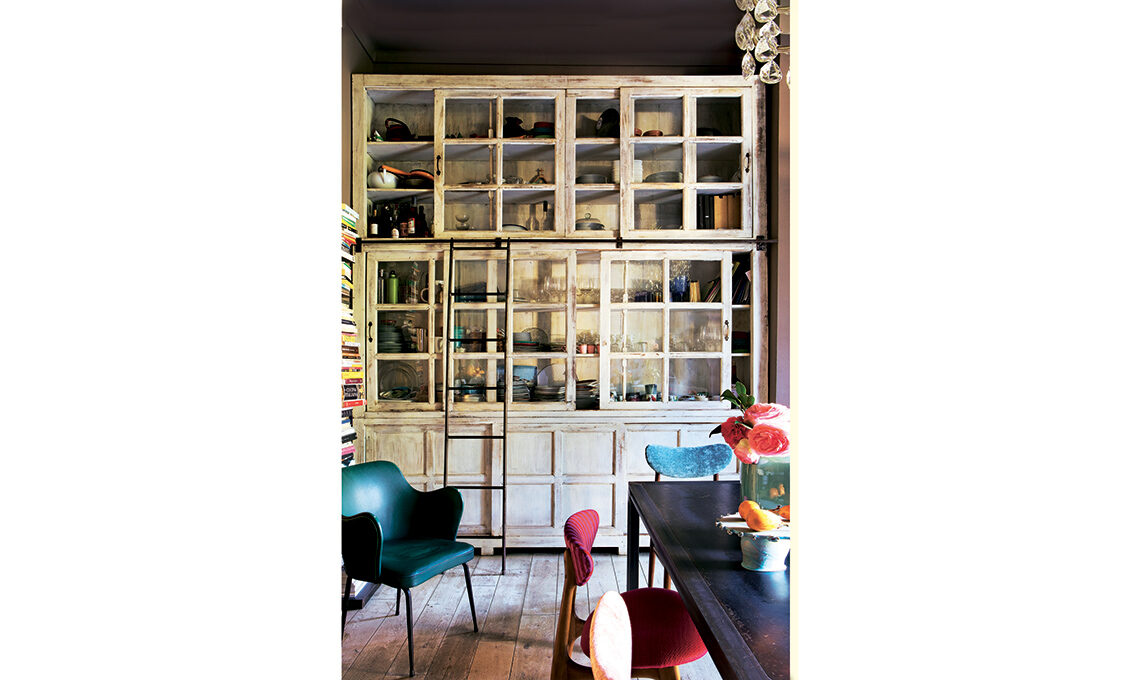 Attorno al tavolo, sedie della collezione Anni Cinquanta: Carlotta compra sedute vintage e le reinterpreta con tessuti giocosi. Lampade Tolomeo Braccio a parete, in alluminio lucidato e diffusore in alluminio anodizzato [Artemide, cm 131 € 285]. libreria verticale self standing Ptolomeo, in acciaio [Opinion Ciatti, cm 160h € 874].
