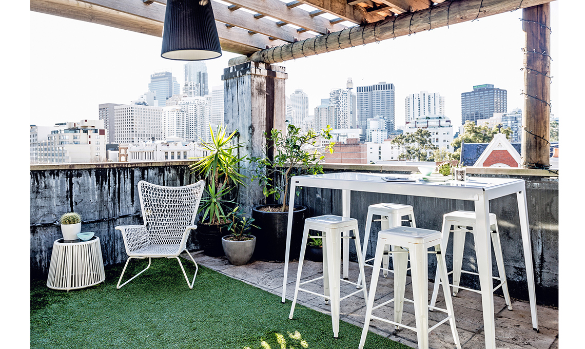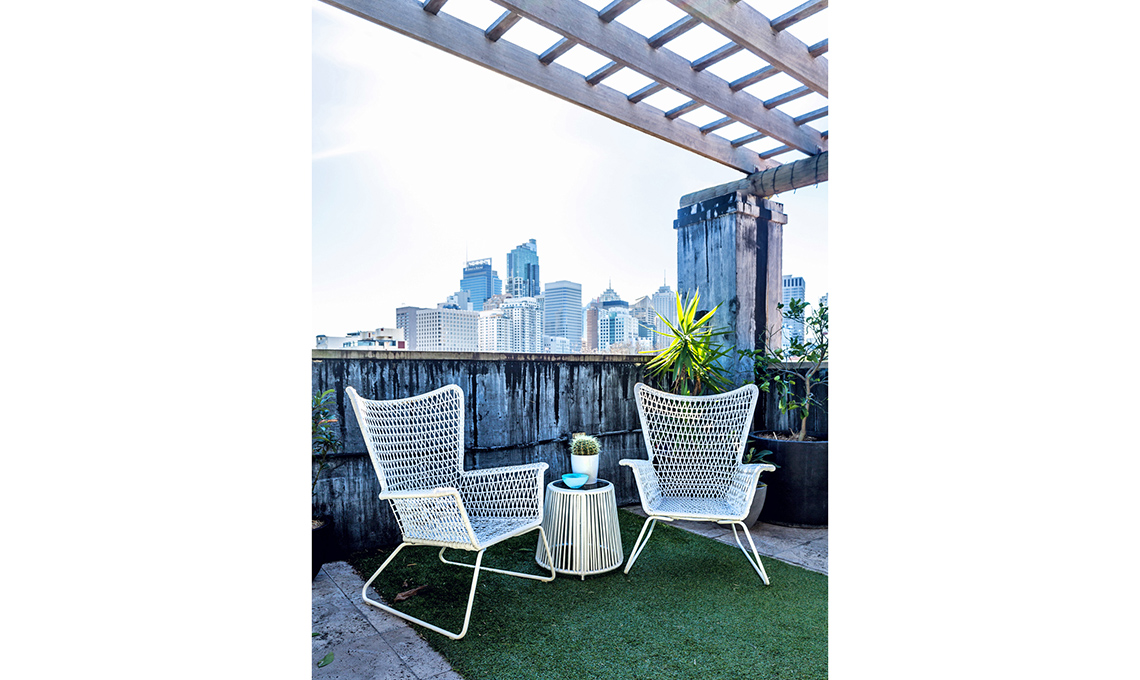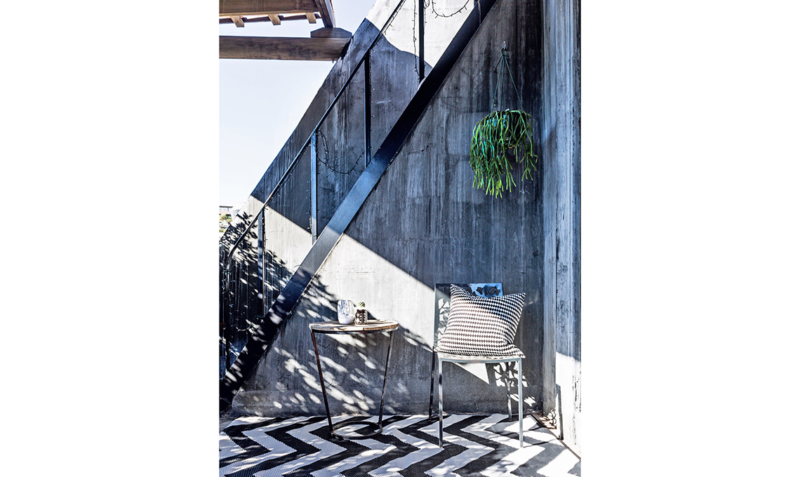 Poltrona in acciaio e polietilene [Ikea, cm 74x78x93h]. tavolo alto e sgabelli da bar [Tolix]: se cerchi un’alternativa simile la trovi su manomano.it. Un prato sintetico di bell’aspetto e resistente è Vitoria alto cm 0,4 con effetto memory [OBI Italia, ø m 2x4].