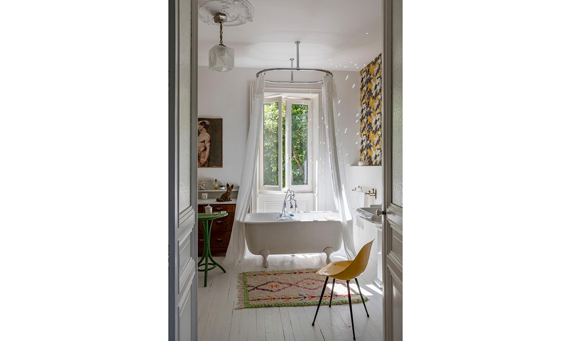 la carta da parati già utilizzata sotto le scale ma in un’altra nuance. Bella anche l’idea della vasca con i piedi al centro della stanza: è proprio da sala da bagno, in linea con il sapore d’altri tempi di tutto l’ambiente!