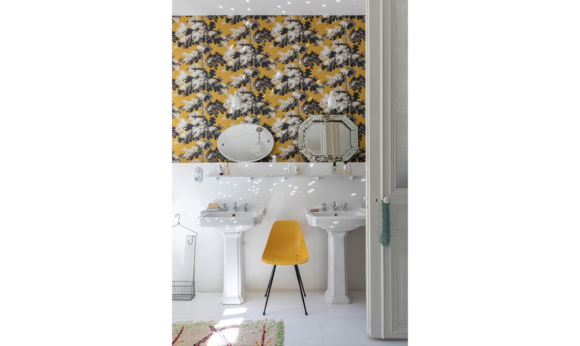 Carta da parati Raphael [Sandberg], tappeto [Cosydar-deco], sedia Trèfle di Jean-René Caillette, Anni ’50. Lavabi [Hudson Reed]. Cerca gli specchi molati vintage nei mercatini, nei negozi di modernariato oppurfe su siti come ebay.it etsy.com.
