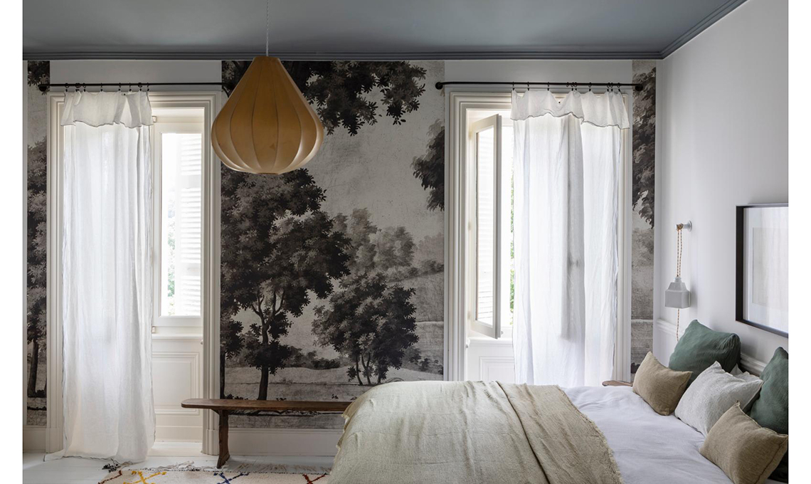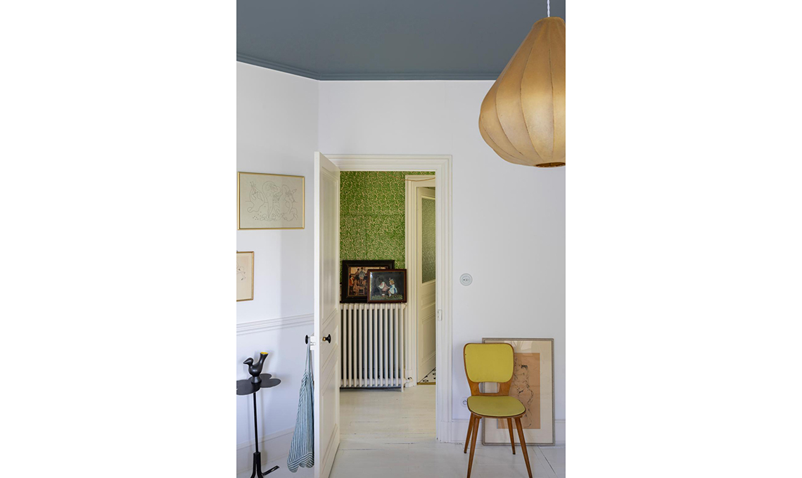 N. 299 di [Farrow & Ball] induce ad alzare lo sguardo e infonde relax quando si sta distesi. Il resto è un bianco ovatta che si tinge con i colori pastello della biancheria del letto, in perfetto dégradé.