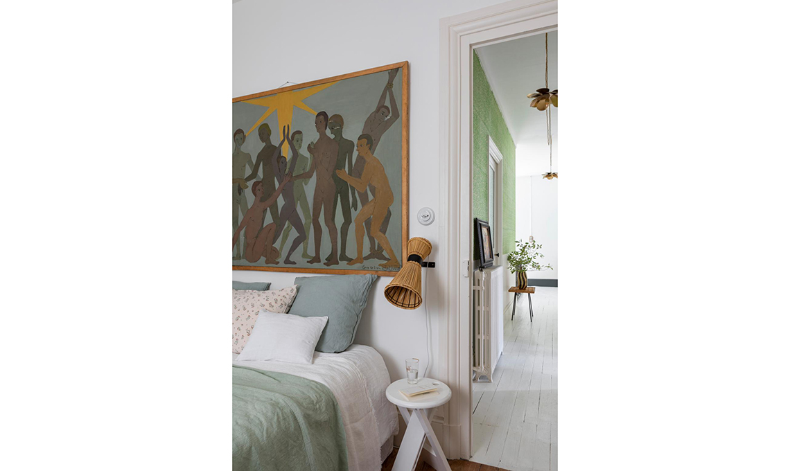 Carte panoramiche come questa le trovi su ananbo.com. Lampade da parete [Alix D. Reynis], tappeto su cosydar- deco.com, biancheria [Maison de Vacances] e [Harmony Textile], tende [Bouchara]. La sospensione è un modello Cocoon ‘a cipolla’ Anni ’70. Cercali su Pamono o 1stdibs. Nuovo invece c’è Tea, in jersey beige, di [H&M Home su www2.hm.com].