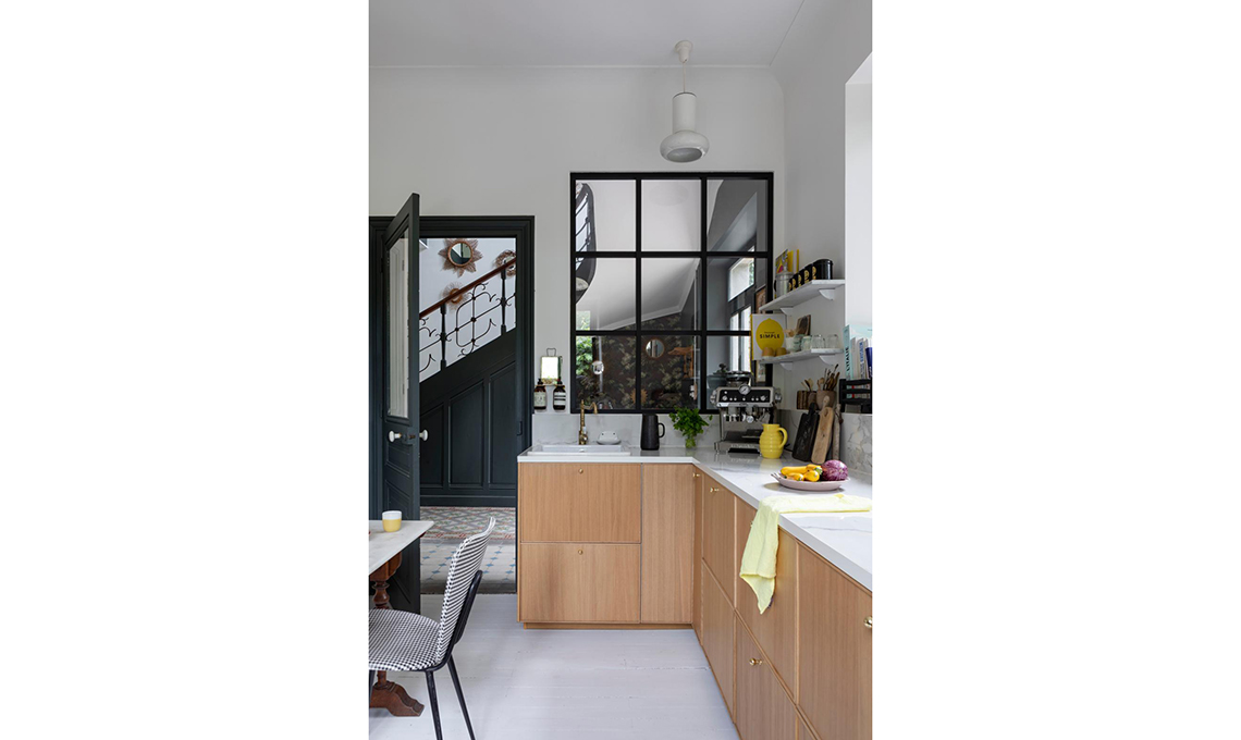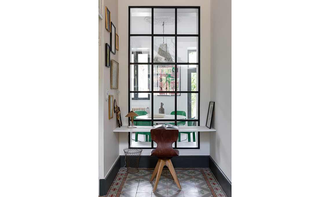 si inserisce la vetrata in ferro che lascia passare tanta luce e mantiene in comunicazione i due ambienti; sul lato