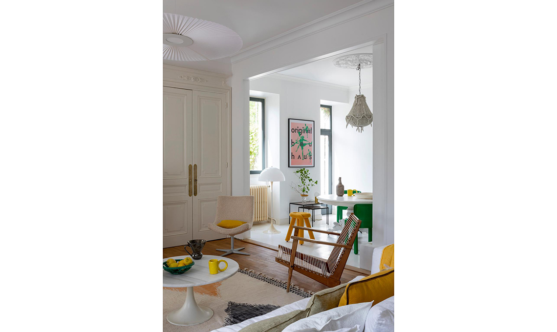 le iconiche Tulip chairs, di Eero Saarinen, Anni ’50, fanno gruppo insieme a tre esemplari in rattan scovati in un mercatino di Lione.