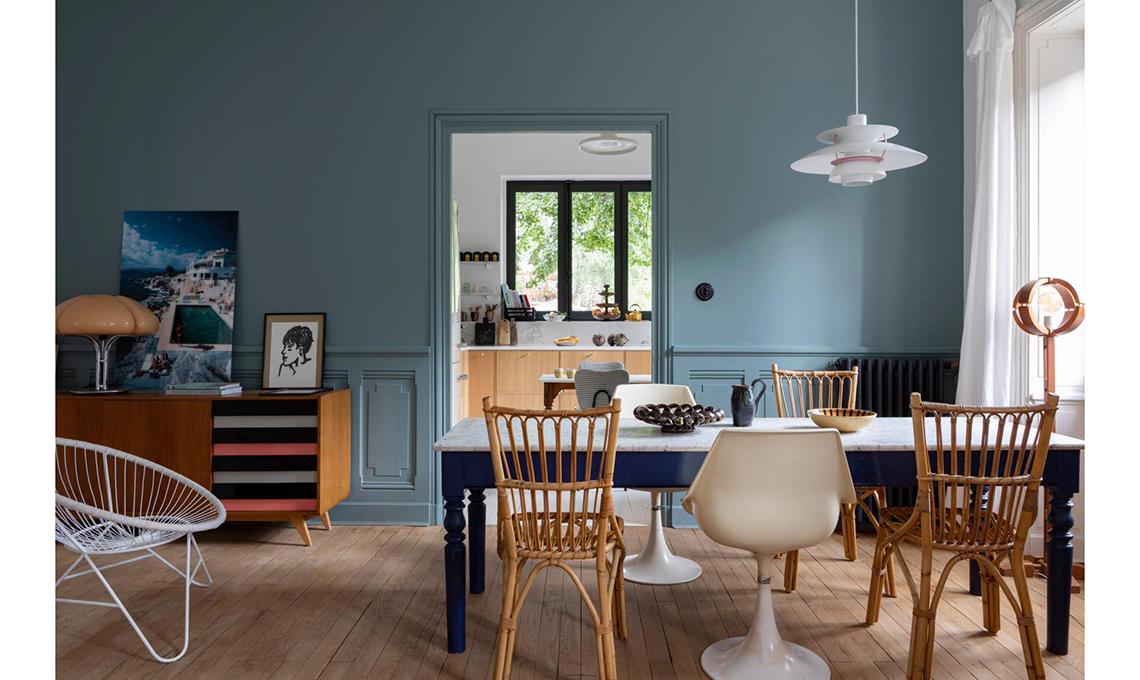 Una nuance speciale è stata scelta per il camino: è Railings, un nero con un elegante sottotono blu, pensato proprio per gli elementi in ferro come camini, tavoli, ecc.