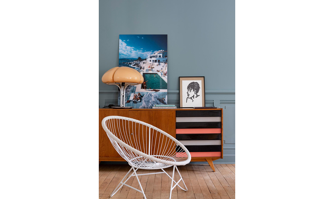 Non soltanto gli arredi: qui tutto è vintage o vintage style, a partire dalla sospensione, dalla lampada sul mobile, fino ad arrivare al dettaglio degli interruttori neri. Lampada da tavolo Quadrifoglio, Anni ’70, di Gae Aulenti per [Harvey Guzzini] e seduta Acapulco simile a quelle su vidaxl.it e westwing.it.