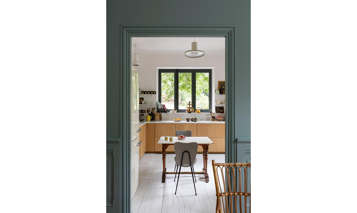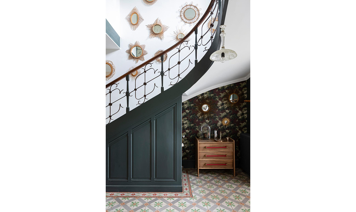 con la sua imponenza funziona come un richiamo visivo, accompagnata dalla wallpaper Raphael di [Sandberg], che rinforza le tonalità rosse delle cementine. Il suo colore? È Studio Green N. 93 di [Farrow & Ball], un verde così scuro
