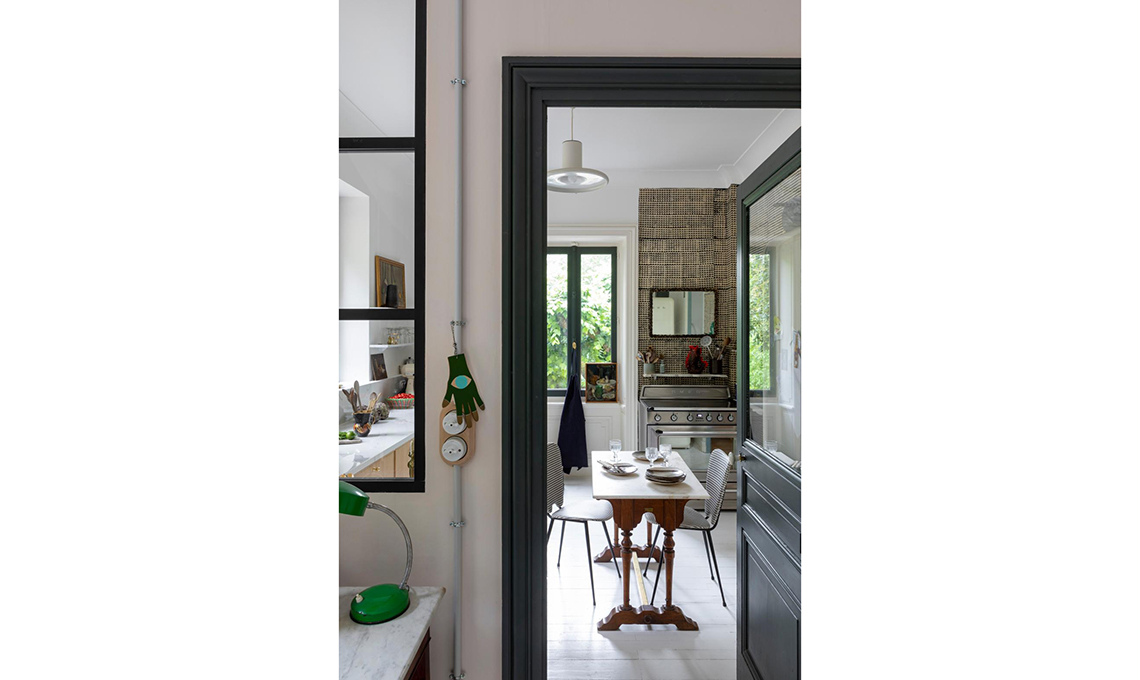 Nella sala da pranzo il tavolo è un pezzo che arriva da una vecchia pasticceria. Sonia l’ha restaurato mantenendo il marmo originario: non