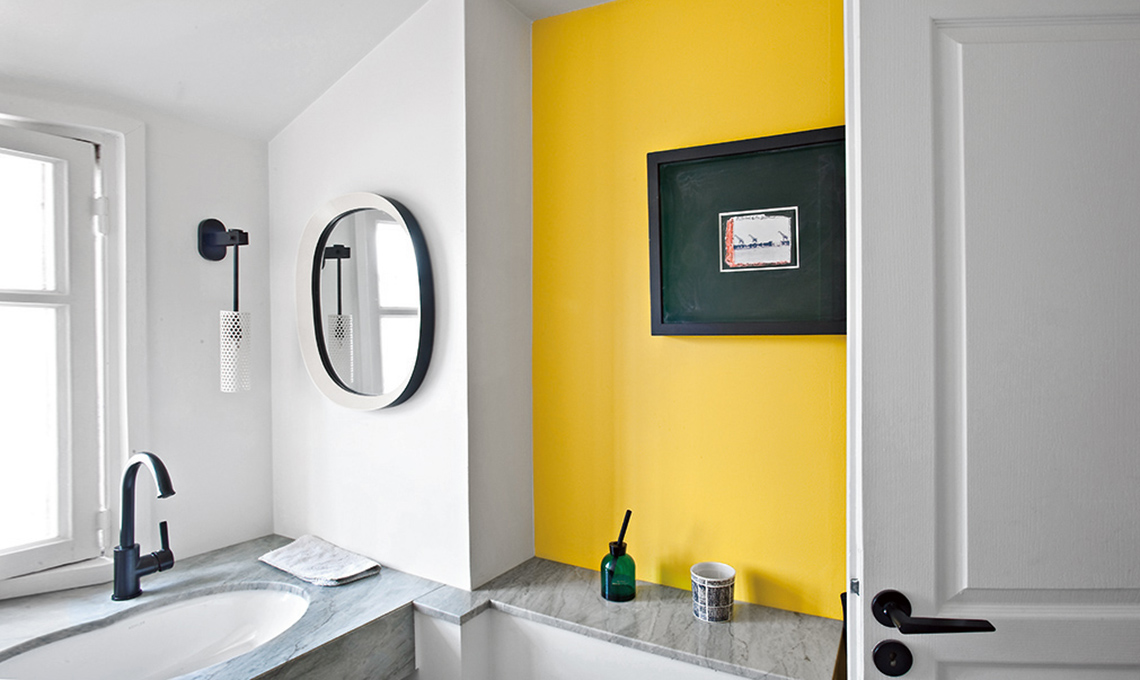 Un colore inatteso è protagonista nel bagno: un bel giallo intenso che dà slancio all’ambiente. Sull’altra parete, sopra il lavabo, un’applique in ottone e uno specchio dalle forme vintage. Davvero très chic!