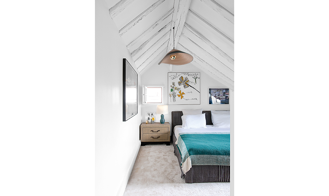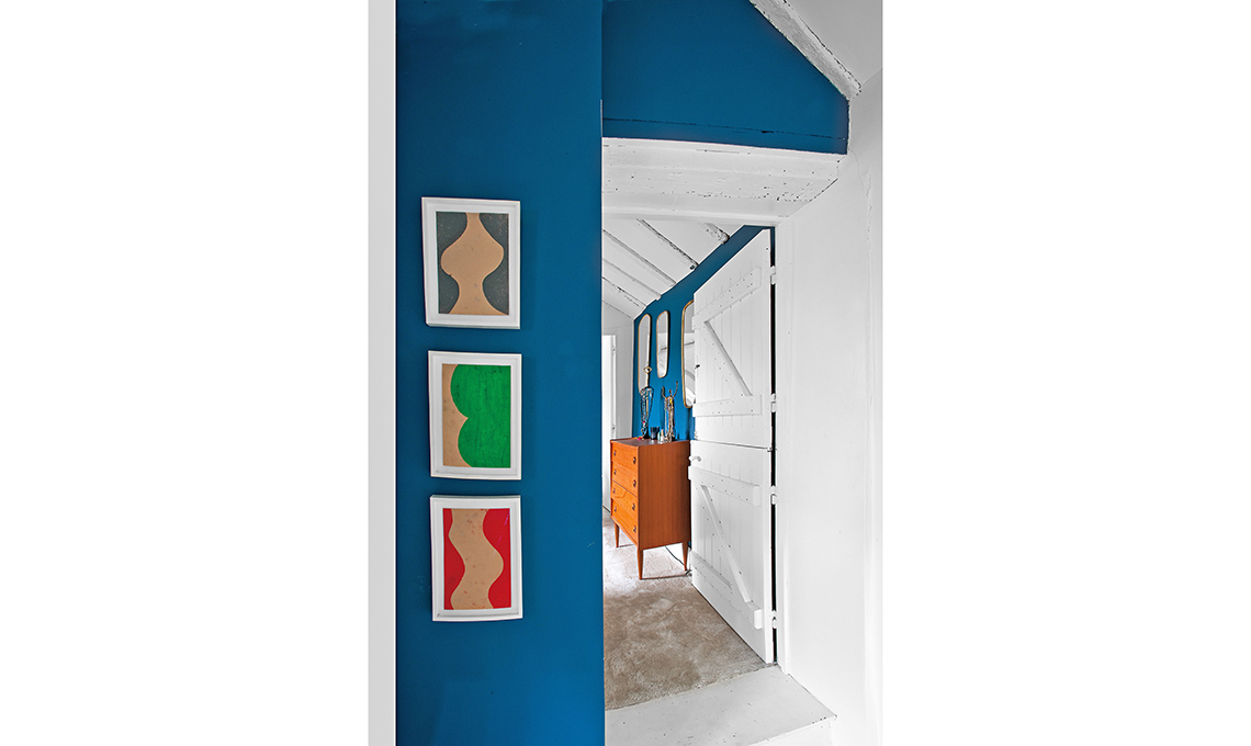 Alla camera da letto si accede attraverso una vecchia porta da stalla, che Sarah ha recuperato dipingendola di bianco. A pavimento c’è una moquette beige, che dà risalto al mobile Anni ’50 e agli specchi vintage sulla parete blu.