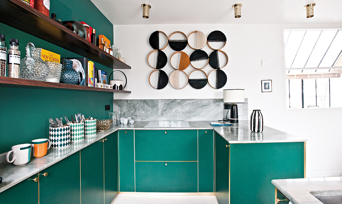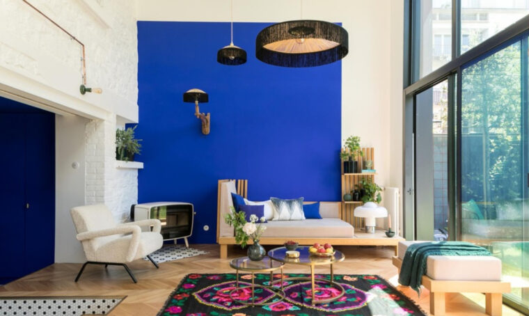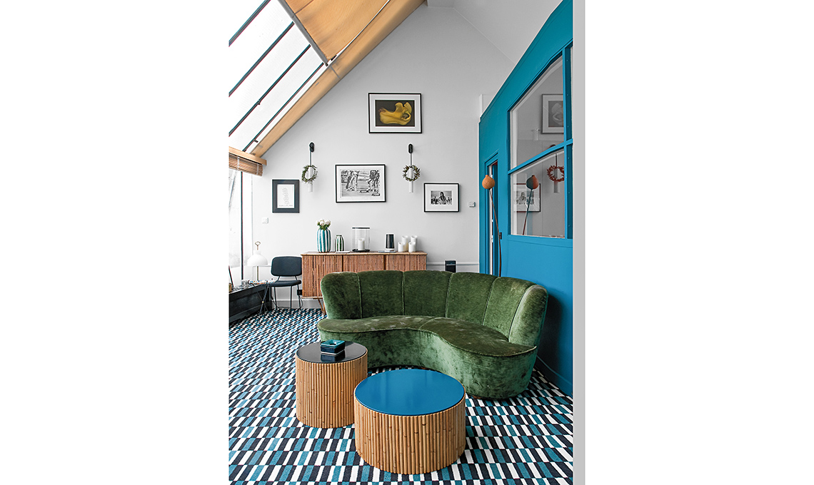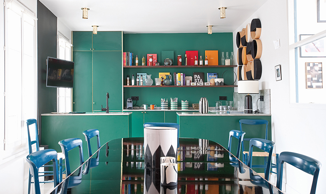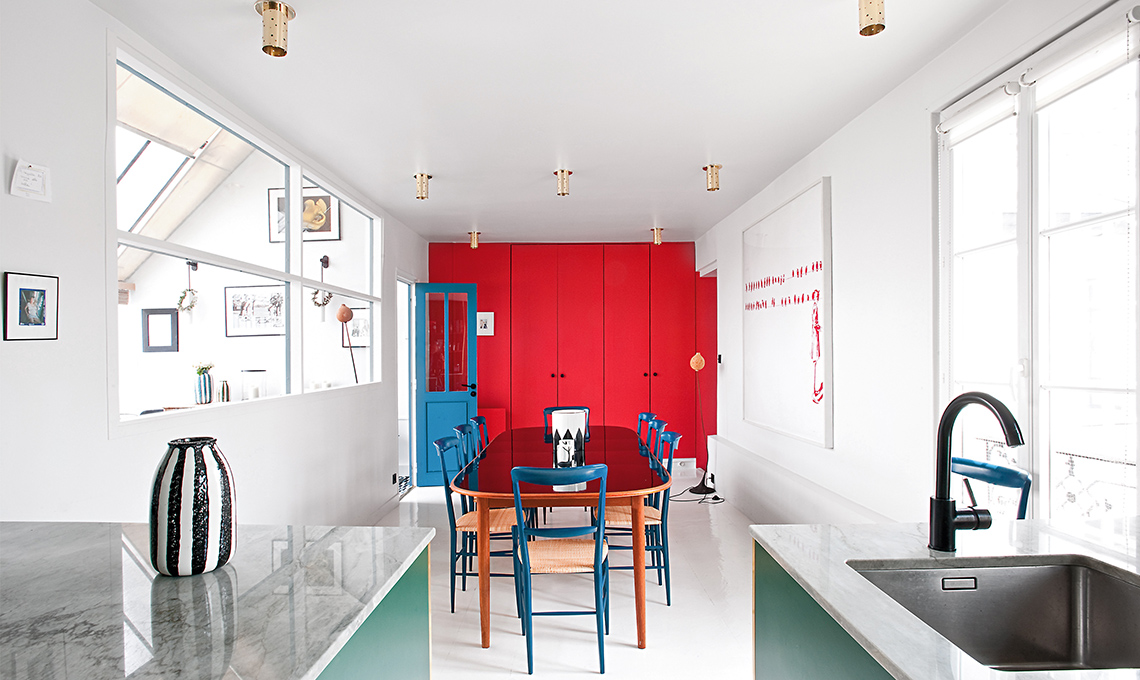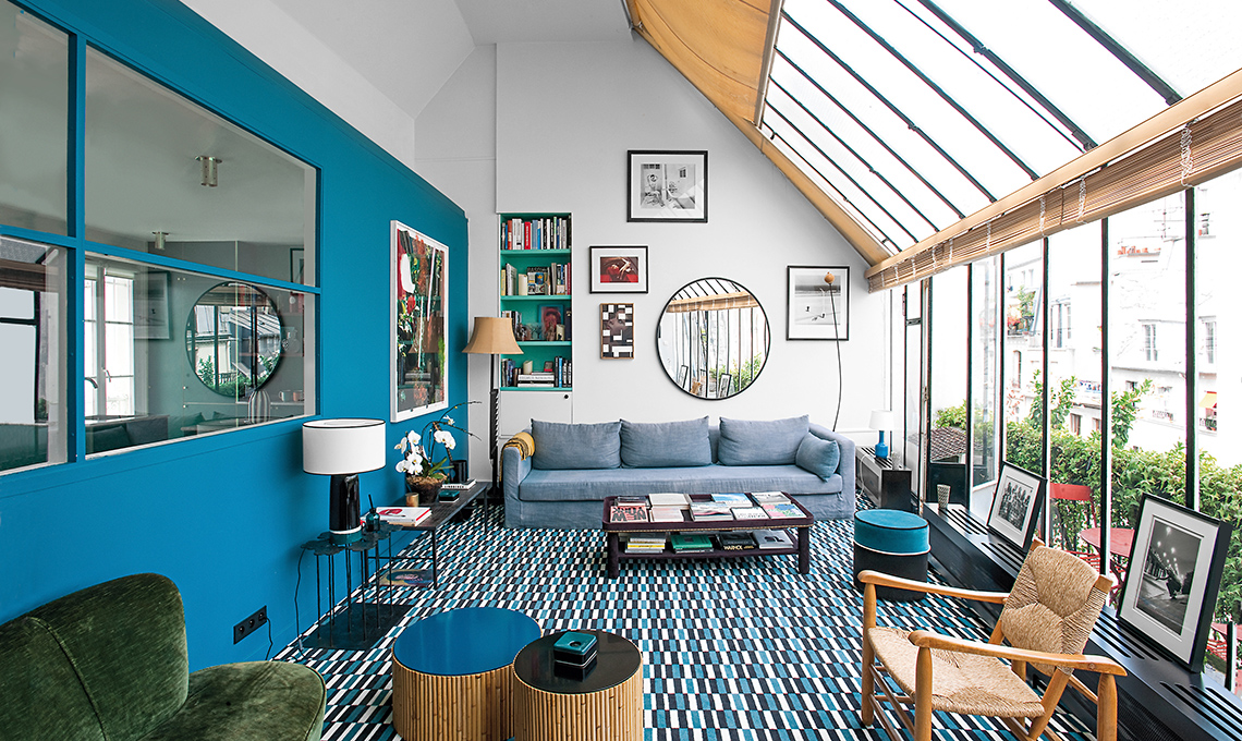 Nel grande living, la parete tutta vetro regala una vista eccezionale sui tetti di Parigi e porta in casa tanta luce, che arriva nella cucina adiacente grazie alle finestre aperte sul muro interno. Il mix di oggetti di design, pezzi vintage e arredi disegnati da Sarah è tenuto insieme dal ‘suo’ blu.