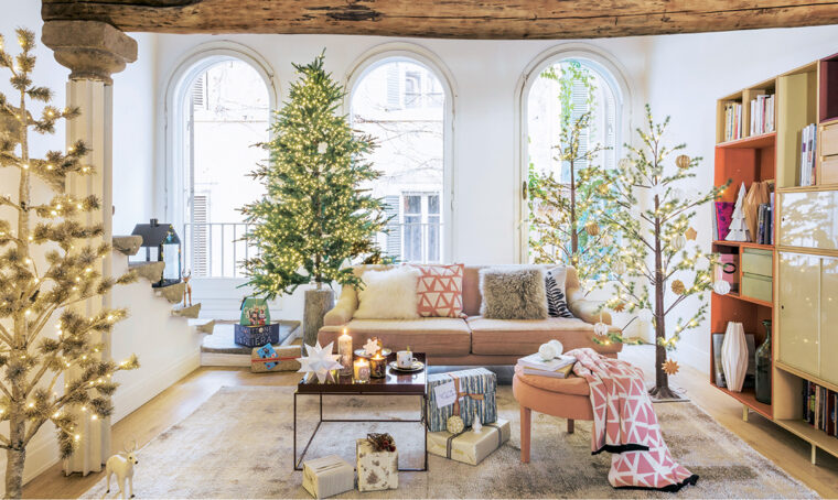 Tavolini Riviera in rattan e legno laccato, posacenere Sicilia e applique Diva, tutto [Maison Sarah Lavoine]. divano vintage Anni ’50 nello stile dei modelli Amédée [Ligne Roset], Zarina [Adele C], Willy [Maisons du Monde] e il Sofà Classico di [Casamata]. Lampada Arenzano di Ignazio Gardella, anno 1956 [Tato].