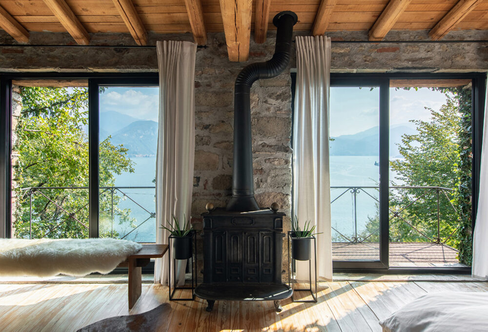 «Prima della ristrutturazione, il camino era lontano dalla zona relax» dice Hélène. Ora è il fulcro attorno cui ruota