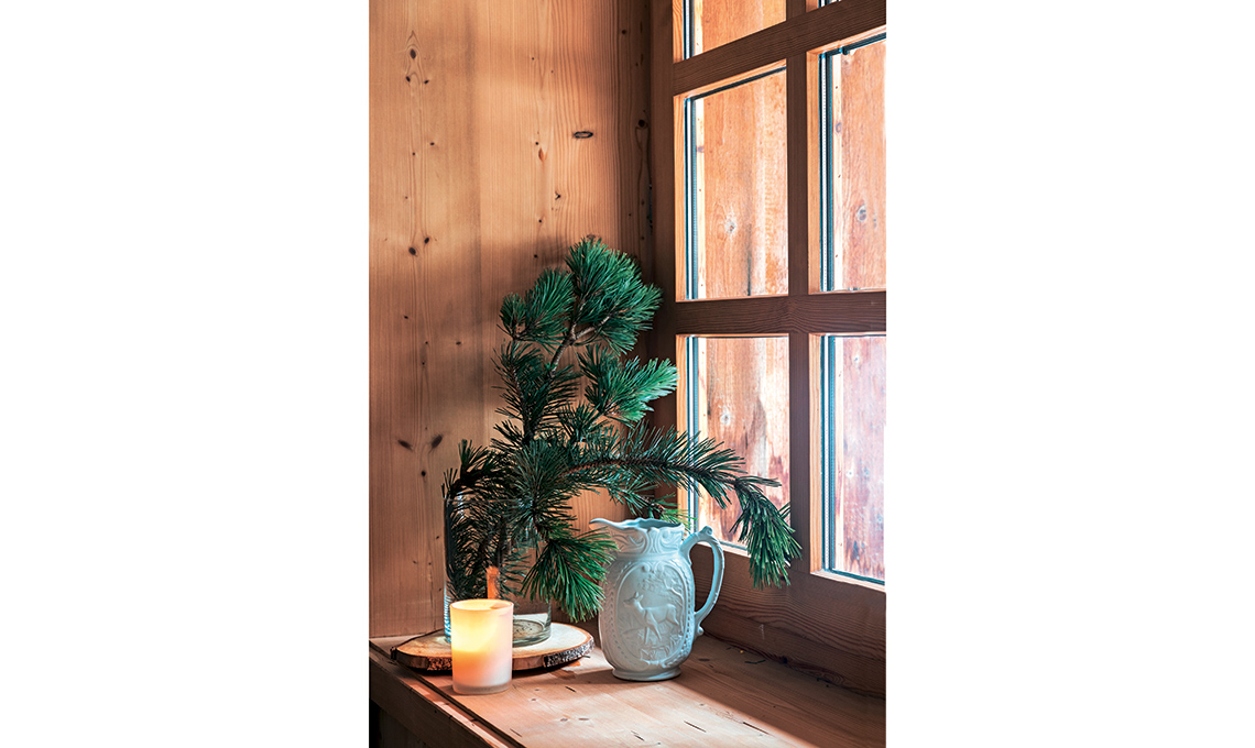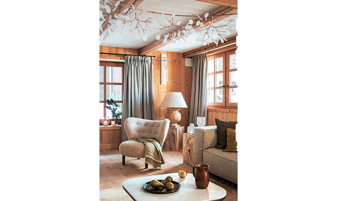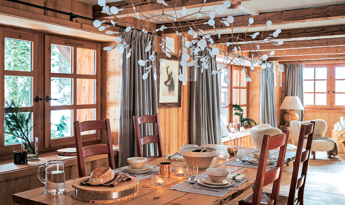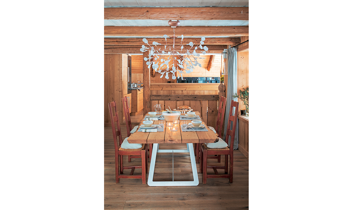 Il legno naturale, reso in parte bianco per dare respiro, si 'accende' con lampadari come fiocchi di neve. In questo chalet dove vorremmo passare le feste, nulla è troppo, tutto è essenziale.