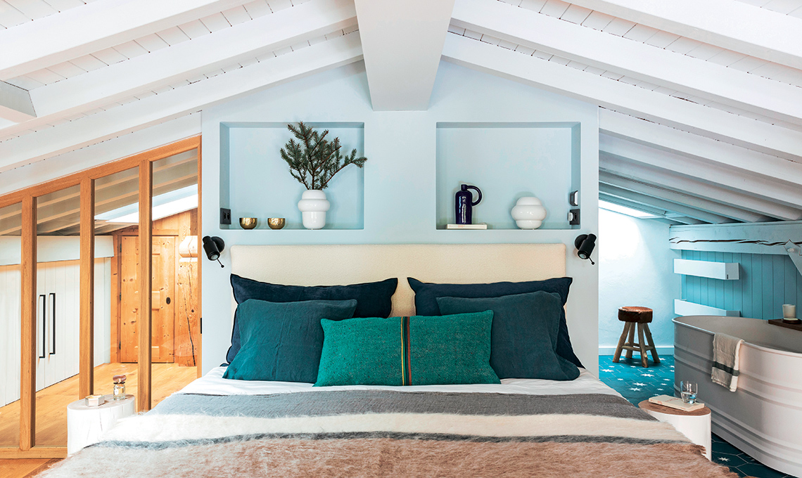 Hélène Roux ha trasformato lo spazio inutilizzato nel sottotetto in una sontuosa camera padronale, ispirandosi alle suite degli hotel a cinque stelle. Dietro la parete in cartongesso che serve da testata per il letto sono celati i sanitari, mentre su un lato una parete vetrata separa la zona storage, con armadi realizzati su misura per sfruttare la pendenza del tetto.