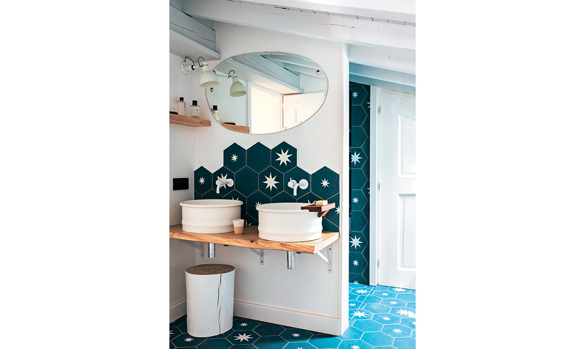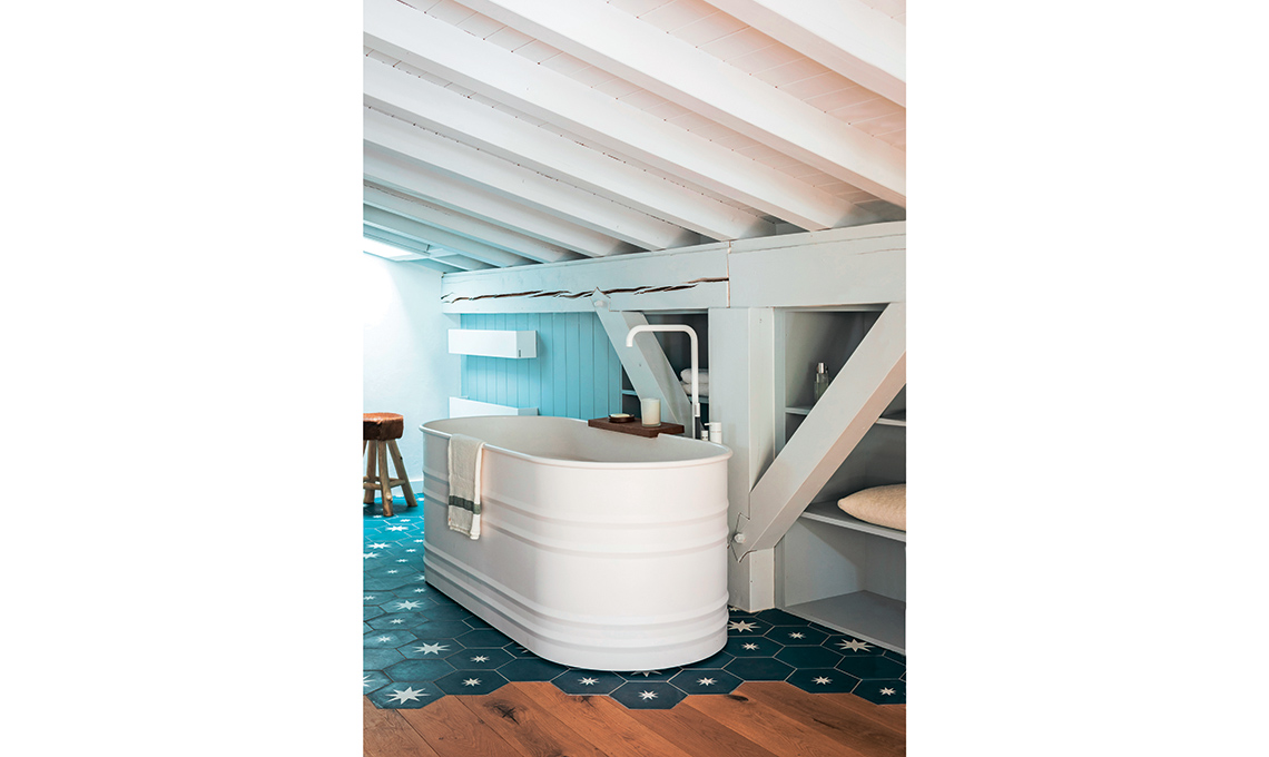 Hélène ha sfruttato il punto più alto dell’ambiente per i lavabi e ha collegato questa zona con la vasca utilizzando il pavimento a cementine che, accostate al parquet, formano un motivo grafico di grande impatto.