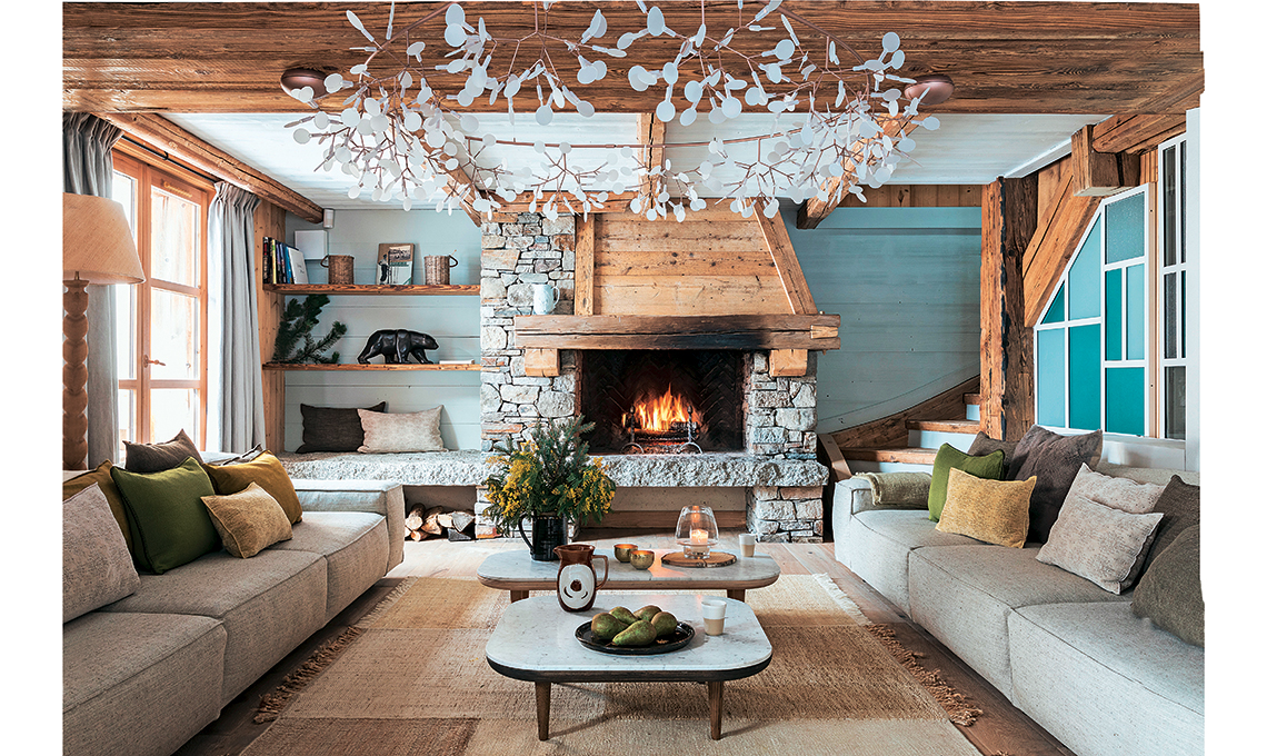 Il punto focale del living è il camino con i divani collocati lateralmente: così lo spazio si apre verso la zona pranzo. La pietra del focolare, il rivestimento crema dei divani e il tappeto écru riflettono il chiarore della neve nel giardino esterno.