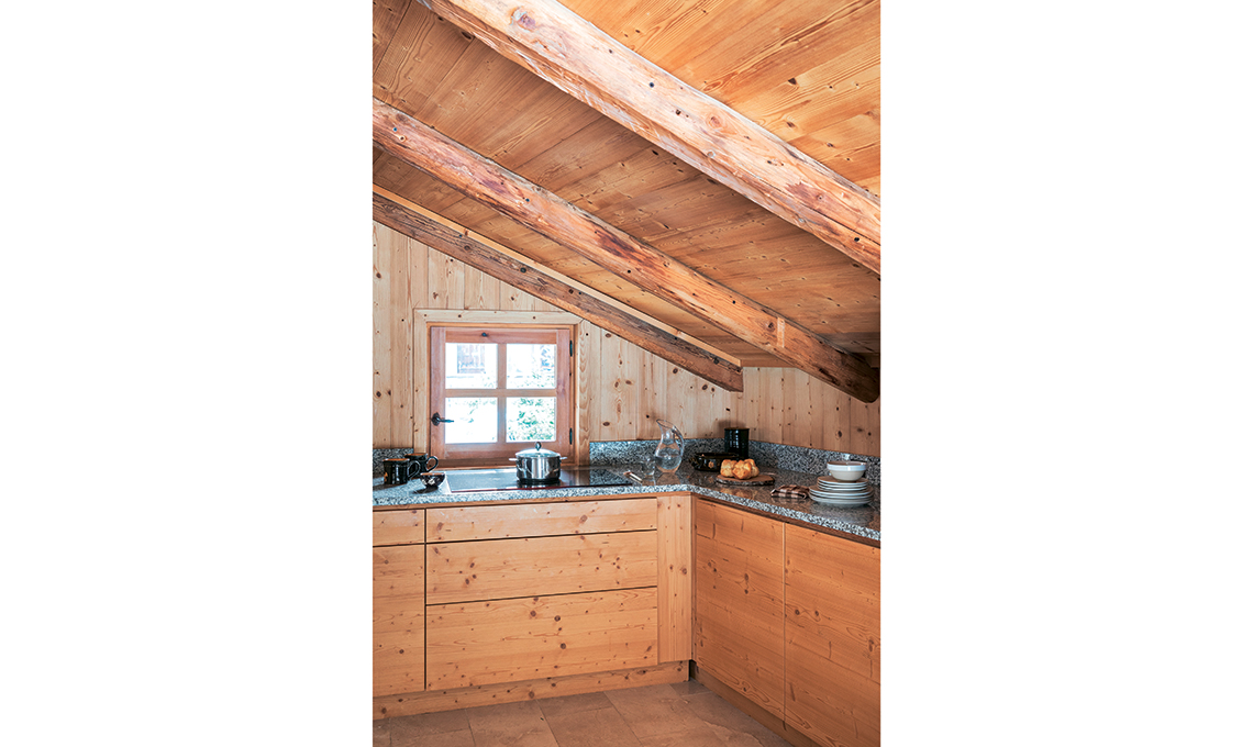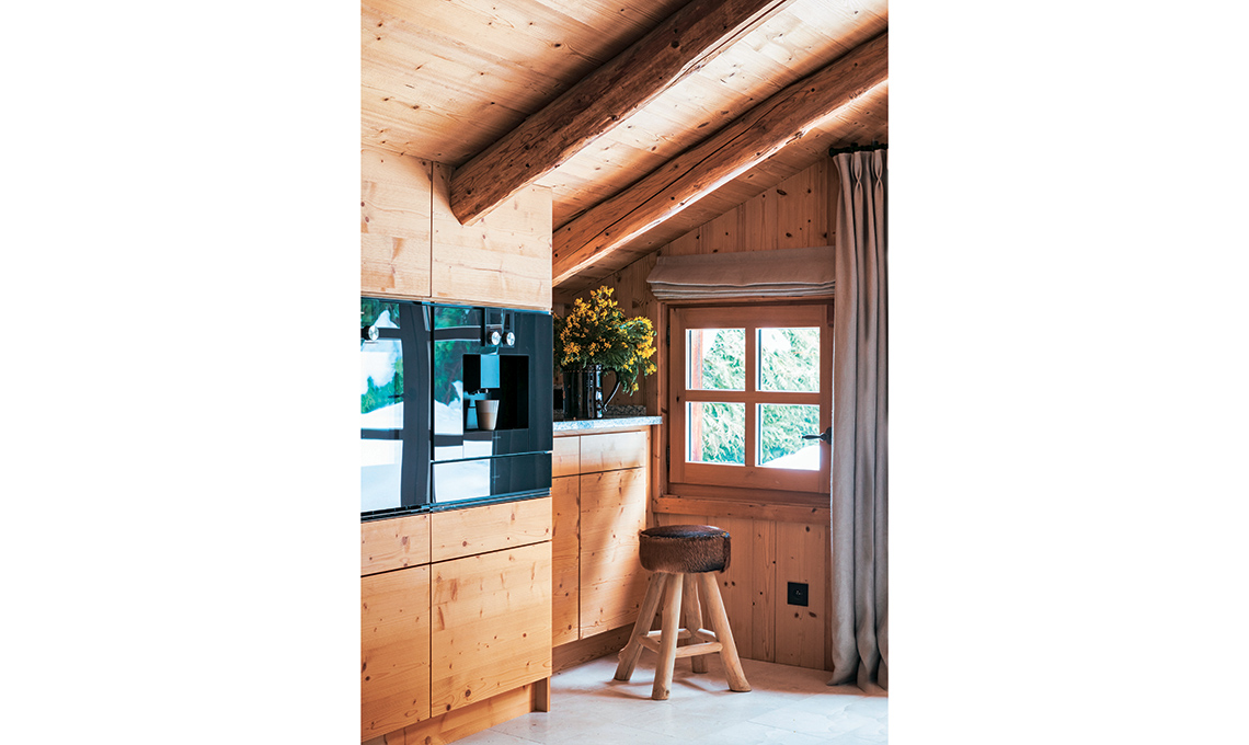 la cucina è quasi sempre realizzata su misura: ciò permette di sfruttare al massimo ogni spazio. In questo caso la struttura, interamente realizzata in abete rosso, è opera di una falegnameria locale. Alla sfumatura dorata dei mobili si contrappone il piano lavoro in granito Mont Blanc lucido.