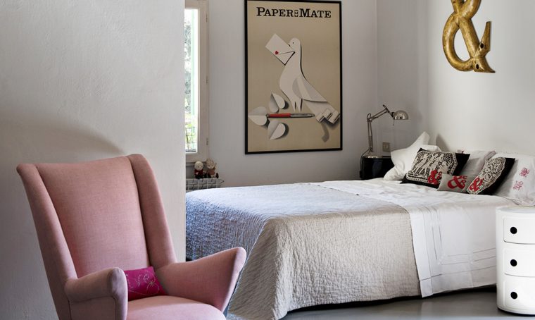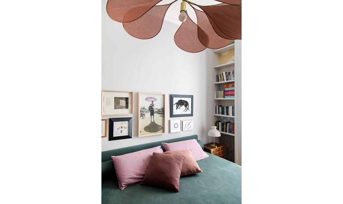 e foto del proprietario di casa e di artisti amici. Il copriletto verde muschio fa da sfondo alla palette nei toni del rosa che ingentilisce l’interno. Lampadario Pale [Georges, ø cm 80]. Sul comodino lampada Anni ’50 Arenzano, design Ignazio Gardella [Azucena].