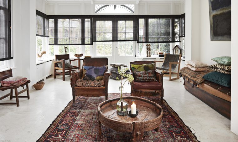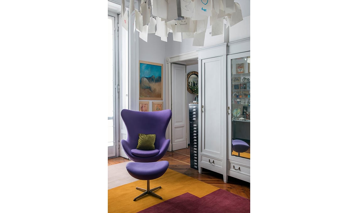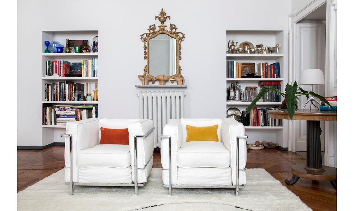 Gli arredi della casa hanno provenienze e storie diverse: qui si incontrano molte icone del design, assieme ad arredi di famiglia carichi di ricordi. Poltrone LC2 di Le Corbusier [Cassina]. specchio veneziano del ’700 e sculture di Valerio Pilon. lampada Lumiere [Foscarini].