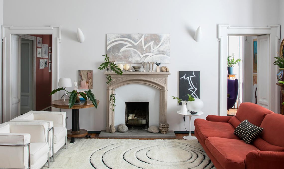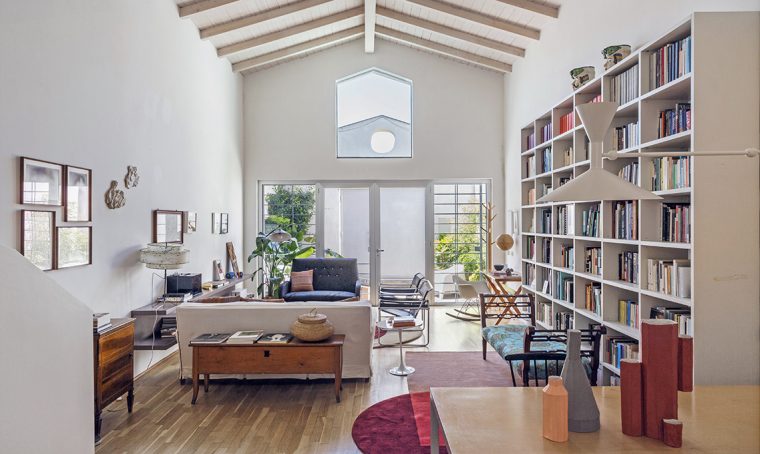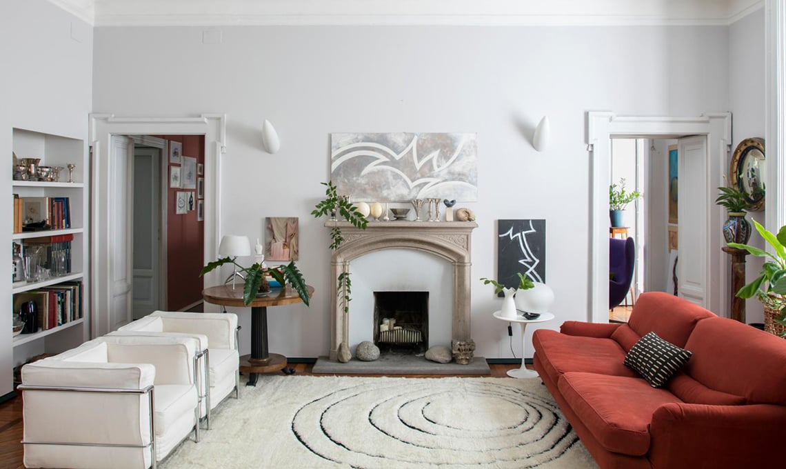 Il salotto è caratterizzato dai toni chiari del bianco. Unica concessione al colore, il mattone del divano Raffles, disegnato nel 1988 da Vico Magistretti per [De Padova].