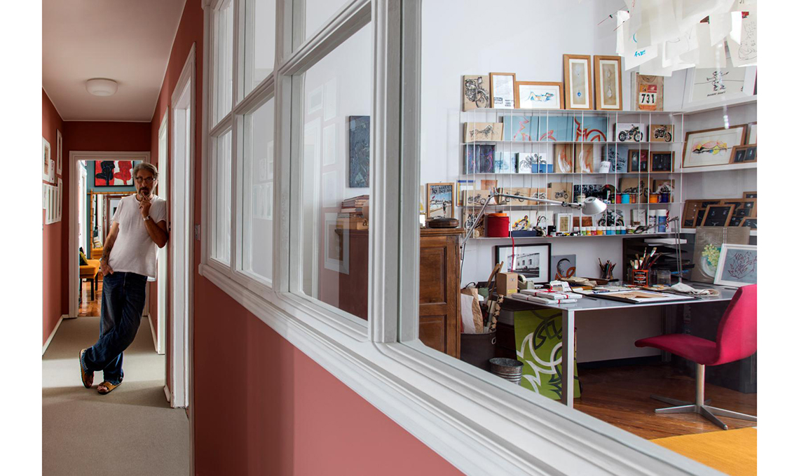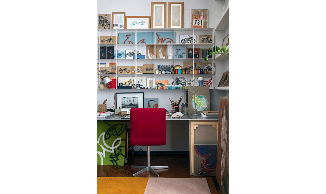 Prima degli ultimi lavori di ristrutturazione, questo era un salottino: inglobando la cabina armadio della stanza adiacente si è trasformato nello studio dell’artista di casa. Qui Andrea, dopo 40 anni di lavoro come designer e produttore di gioielli, si dedica alla pittura. Sulla libreria alcuni dei suoi quadri astratti e degli oltre 500 dipinti dedicati alle moto realizzati in questi anni.